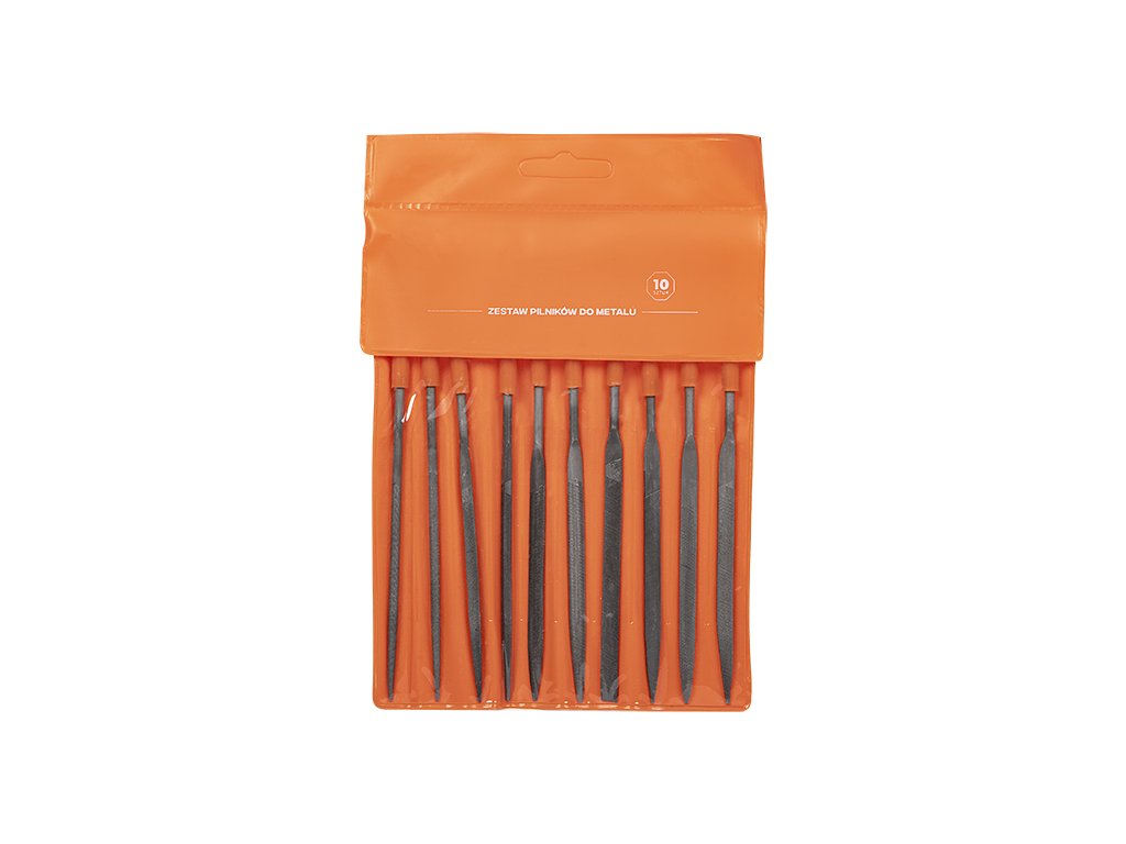 Komplet 10 pilnikov s skupno dolžino približno 140 mm (odvisno od oblike). Vsak pilnik ima drugačno, univerzalno obliko, npr. ploščat, štirikotnik, trikotnik, okrogel. Izdelani so iz visokokakovostnega ogljikovega jekla C45. Pilniki so izjemno trpežni in odporni proti obrabi, kar omogoča večkratno uporabo brez potrebe po njihovi zamenjavi. Ročaj, prekrit s plastiko, zagotavlja boljši oprijem, varnost in udobje pri delu.