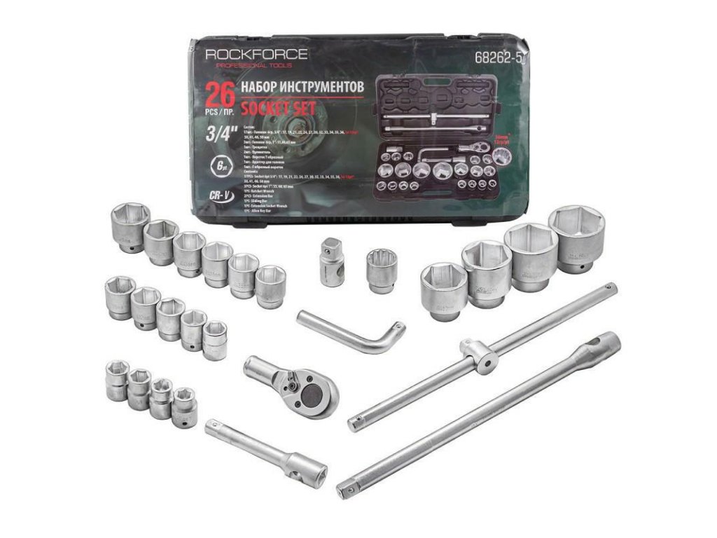 - Vtične 6-oglatega 3/4" - 17 kosov: 17 mm, 19 mm, 21 mm, 22 mm, 24 mm, 27 mm, 30 mm, 32 mm, 33 mm, 34 mm, 35 mm, 36 mm,(36 mm - 12-oglatega), 38 mm, 41 mm, 46 mm, 50 mm