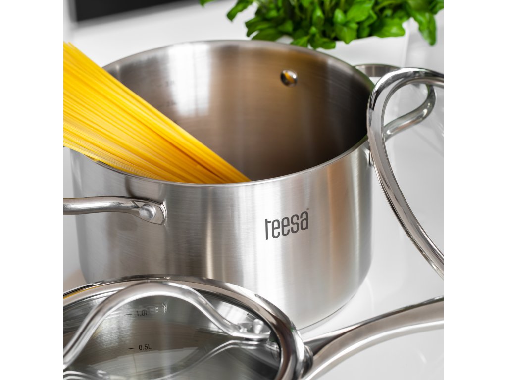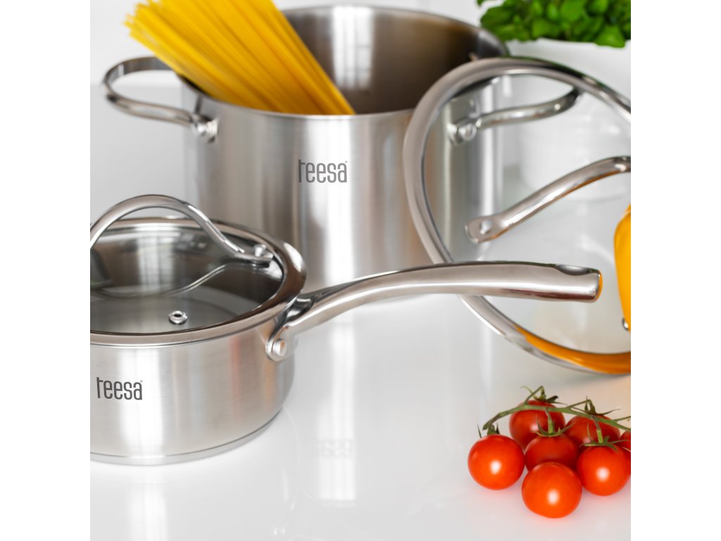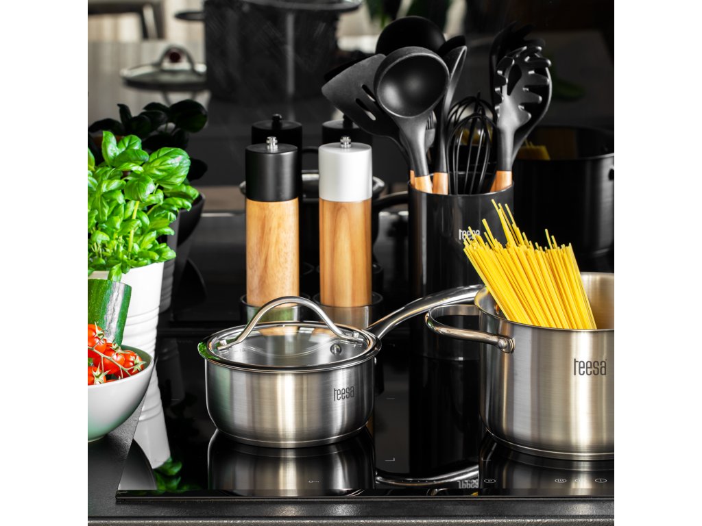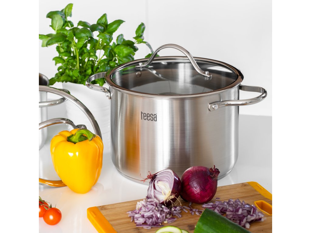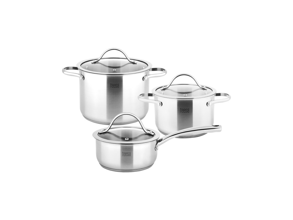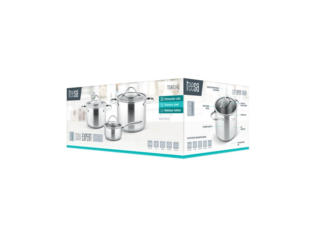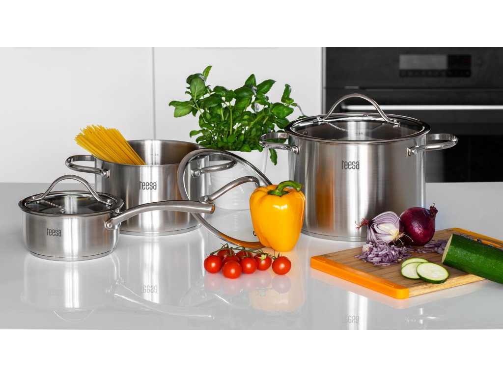 Trdni lonci iz nerjavečega jekla so osnova v vsaki kuhinji. Zato je bil zasnovan komplet loncev Teesa COOK EXPERT MASTER. V komplet spadajo: lonec iz nerjavečega jekla s prostornino 6 litrov in 3 litrov, 1-litrska kozica ter tri pokrovke, kar pomeni popoln komplet, ki ti bo olajšal pripravo različnih vrst jedi. Ustrezna oblika loncev s profiliranimi robovi podpira udobje uporabe in zmanjšuje tveganje razlitja jedi na štedilnik in pulta.