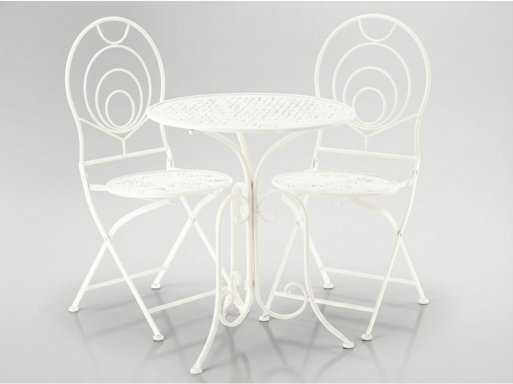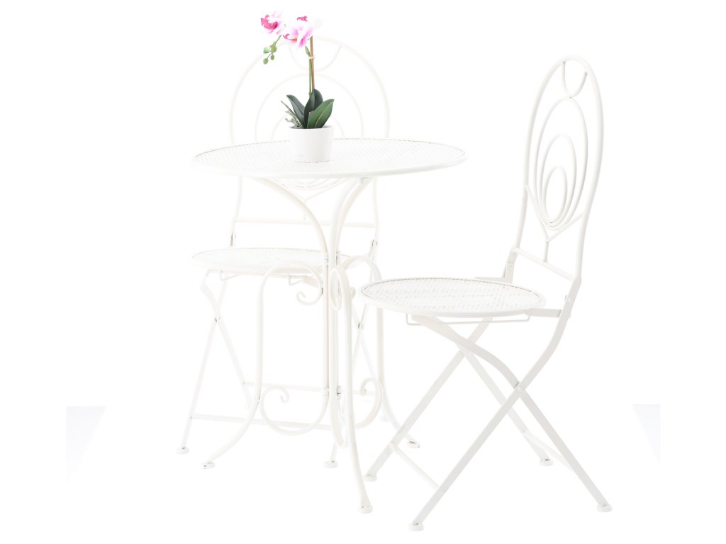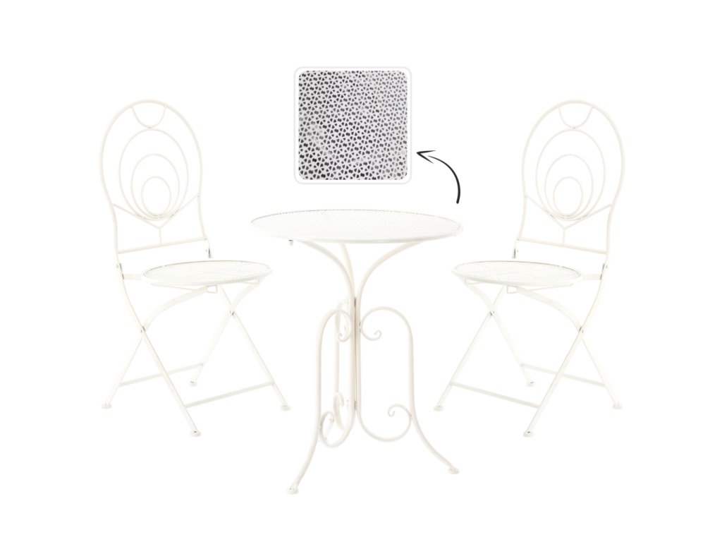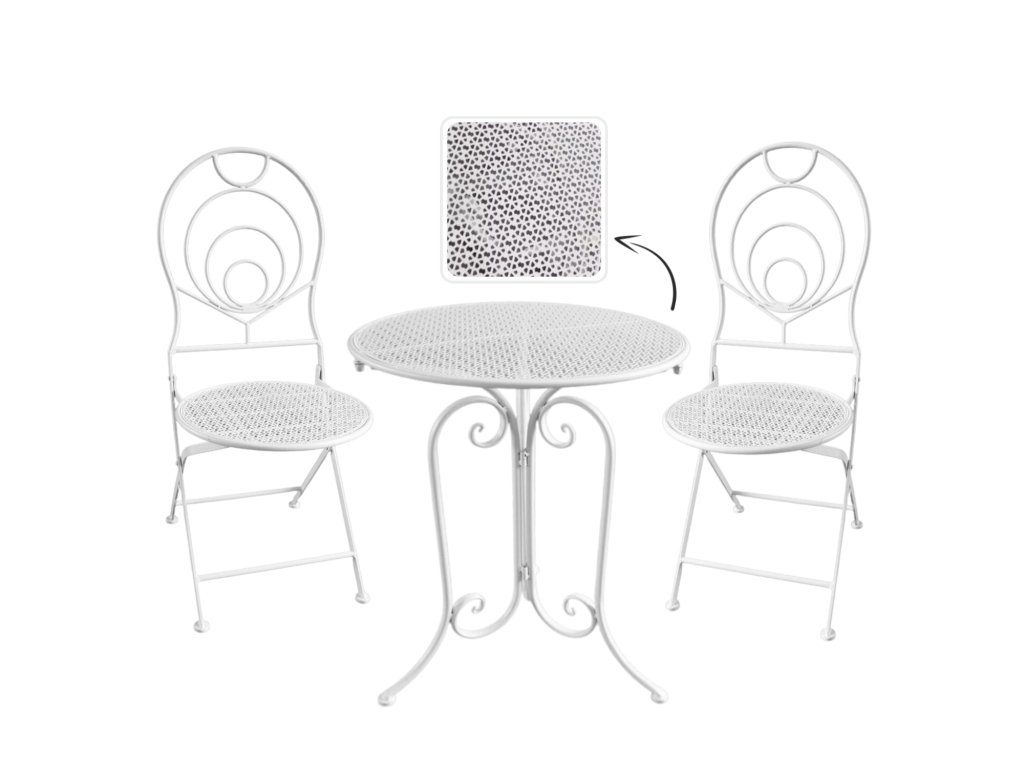 Stilska komplet vrtnega pohištva, navdihnjena s vintage slogom. Eleganten vzorec in klasična bela barva dodajata čar vsakemu dekorju. Odlično se poda na teraso, balkon ali v vrt, ustvarja edinstven prostor za sprostitev.