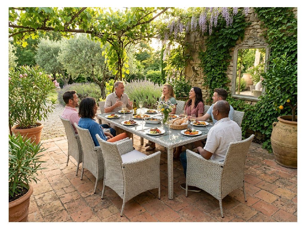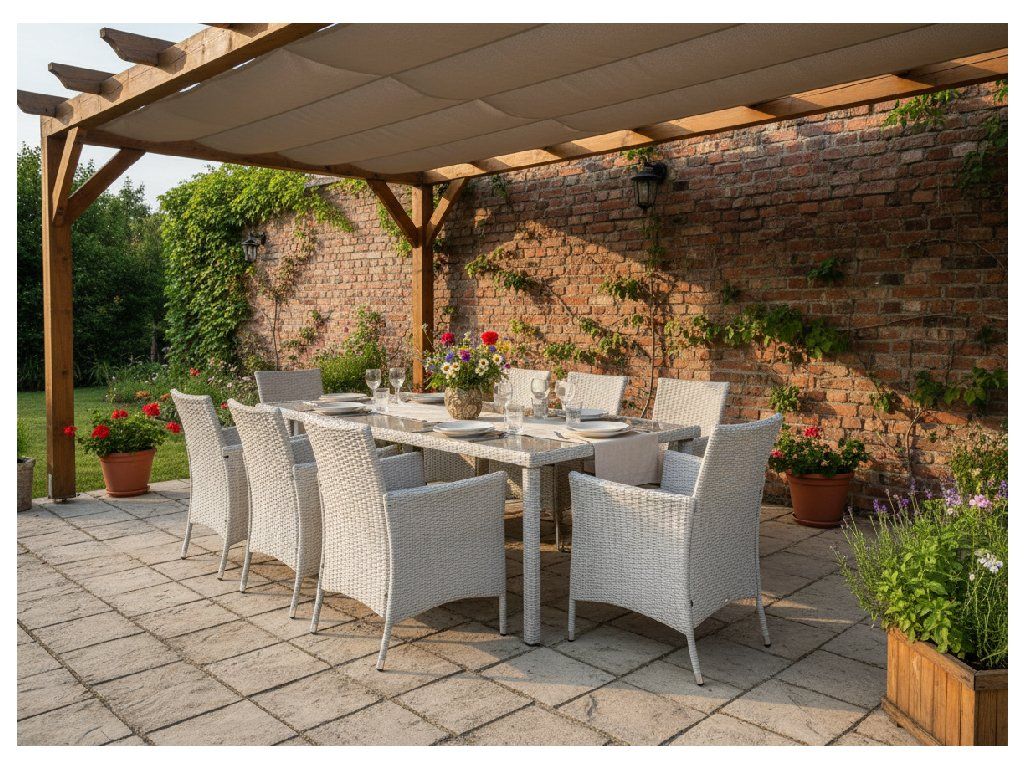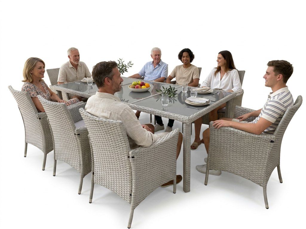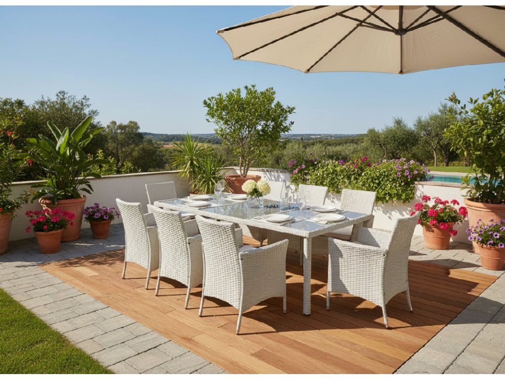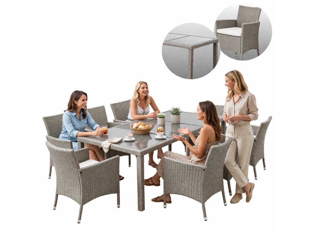 Eleganten jedilni set, sestavljen iz 8 stolov in velike mize. Izdelan iz visokokakovostnih materialov, zagotavlja trdnost in odpornost proti vremenskim vplivom. Cinkana jeklena konstrukcija zagotavlja stabilnost, medtem ko ratan dodaja estetski videz. Vodoodporen material blazin povečuje udobje uporabe in kaljeno steklo na površini mize izpostavlja sodoben dizajn.