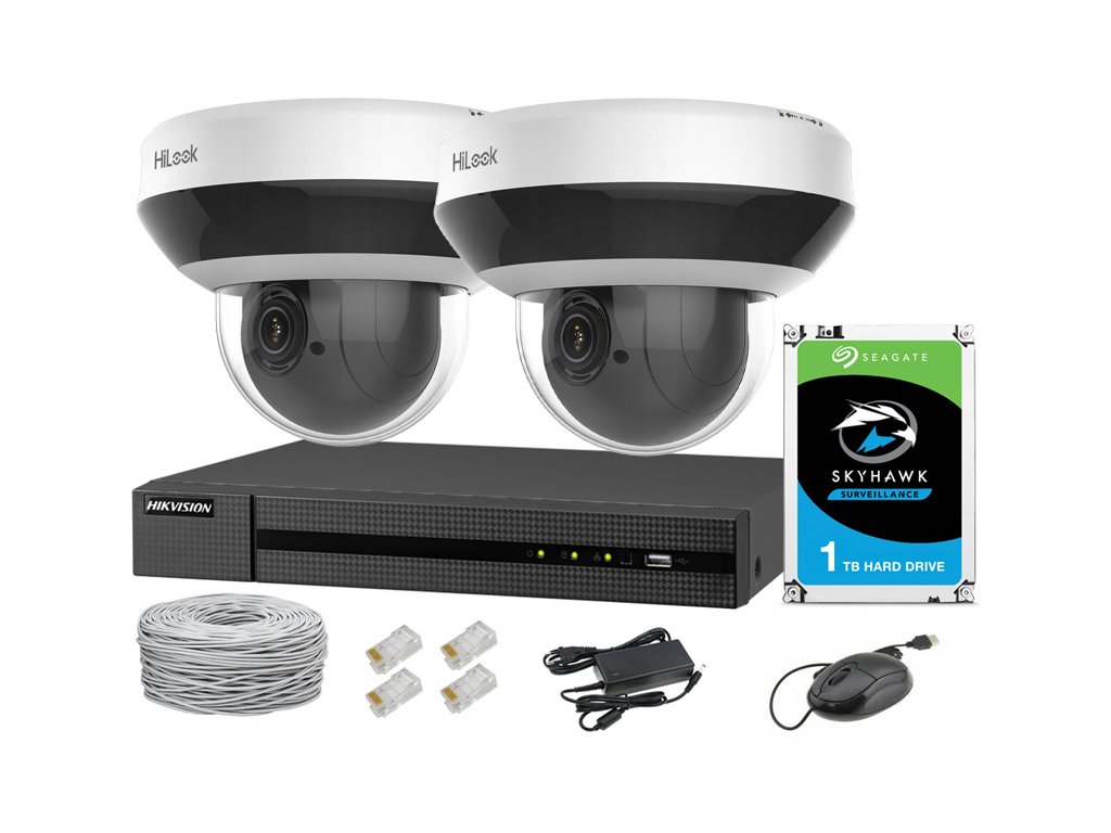 Set za IP spremljanje, 2 vrtljivi PTZ kameri 4Mpx, IR20, NVR 4xPoE, Disk 1TB - Hilook by Hikvision