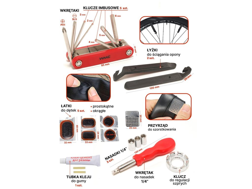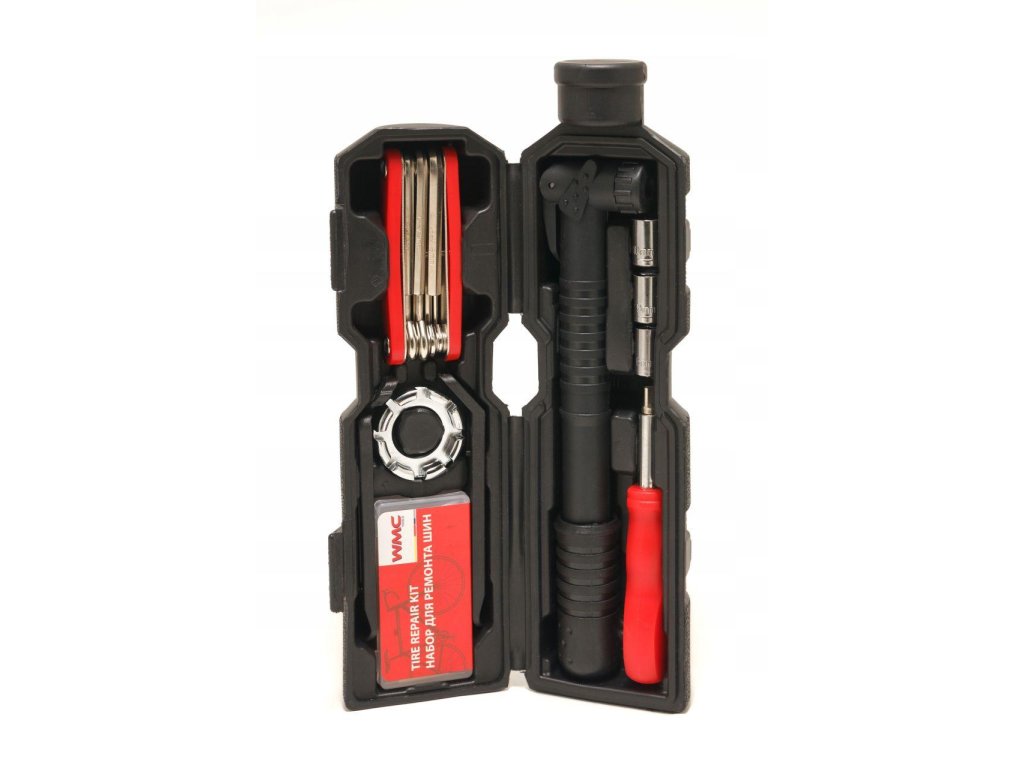 Naš set vsebuje do 27 elementov, pri čemer je majhen in trpežen. S tem popravilnim setom za kolesa lahko zalepite zrak, zamenjate kolo, zategnete matico ali popravite prestavno.