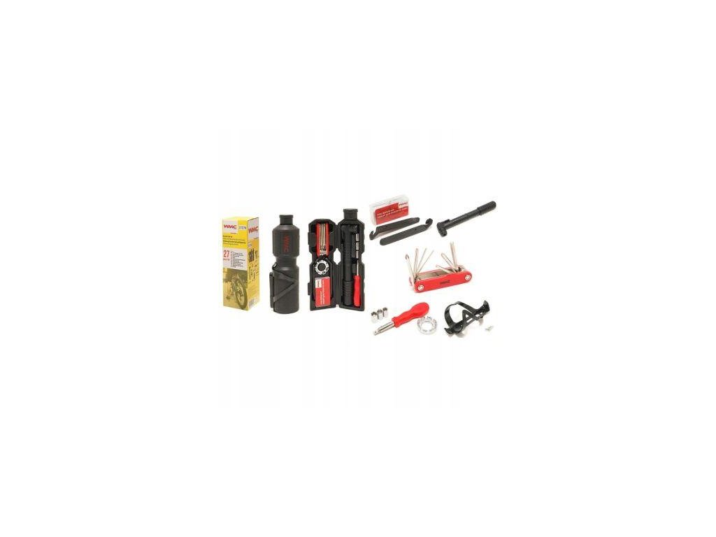 Praktičen set osnovnih orodij za kolo, nameščen v embalaži v obliki bidona.