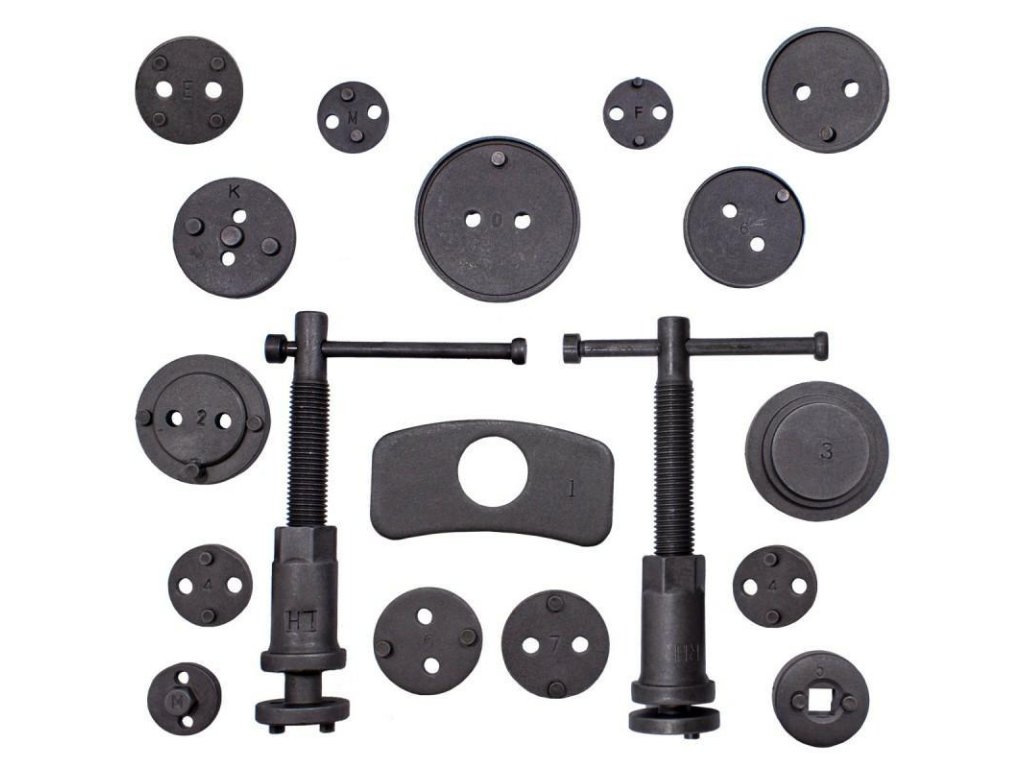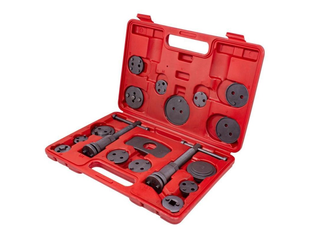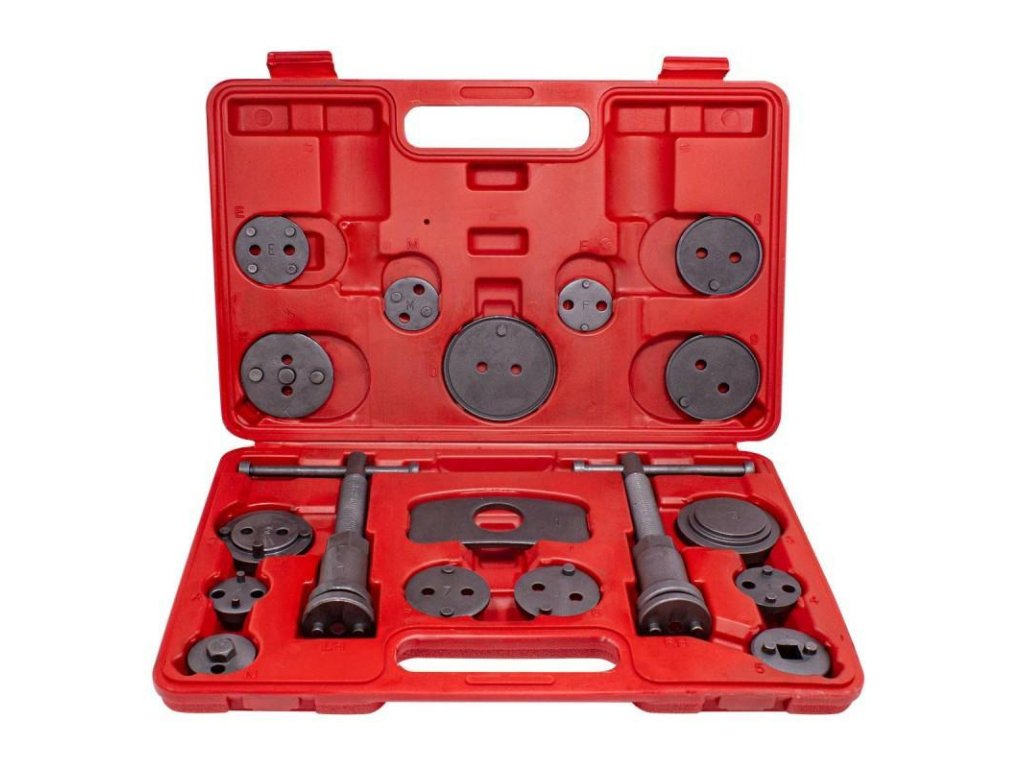 Nepogrešljiv pri popravilih vozil opremljenih z diskovnimi zavorami. Set služi za podajanje (potiskanje) pistonov v valjčkih zavornega sistema. Nepogrešljiv pri popravilih vozil opremljenih z diskovnimi zavorami. Natančno prileganje adapterja in pistona zagotavlja pravilno vstavljanje pistona v valj zavorne čeljusti. Nepogrešljiv za vsako avto servis, kjer pomaga pospešiti servisiranje zavornih sistemov.