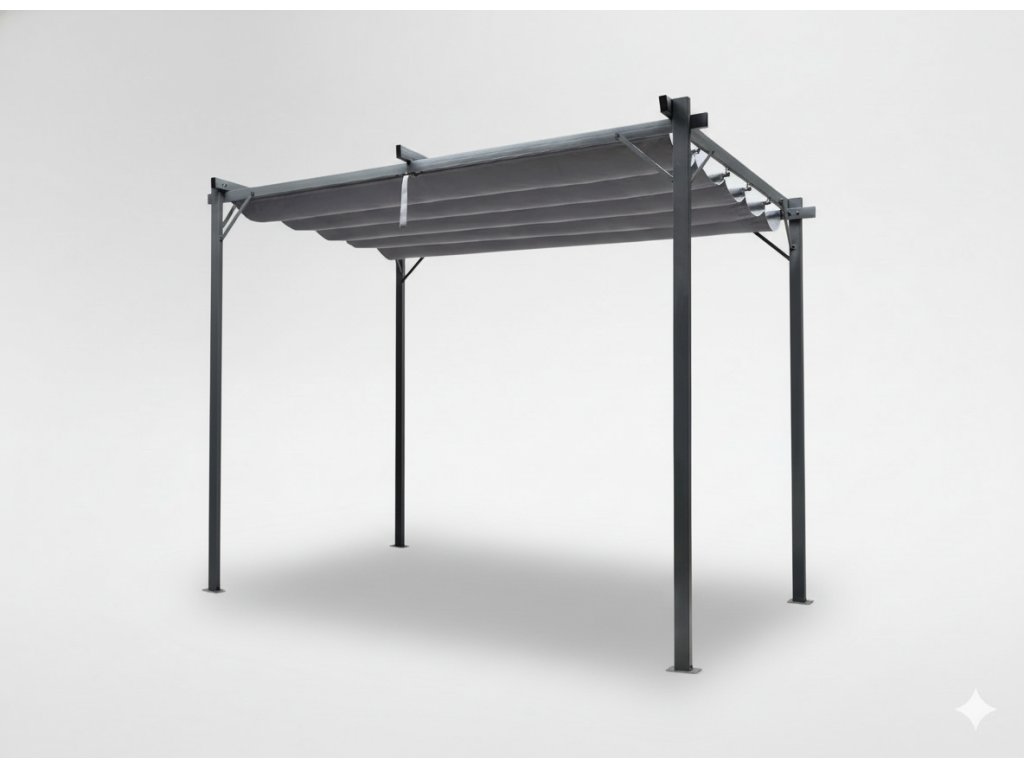 Okvir naše pergole je izdelan iz jeklenih profilov, premazanih s prašno barvo, kar zagotavlja trdnost in stabilnost konstrukcije. Prevleka je izdelana iz debele poliesterne tkanine s gramazo 300 g/m , ki nudi zaščito ne samo pred soncem, temveč tudi pred rahlim dežjem zahvaljujoč svoji vodoodporni konstrukciji.