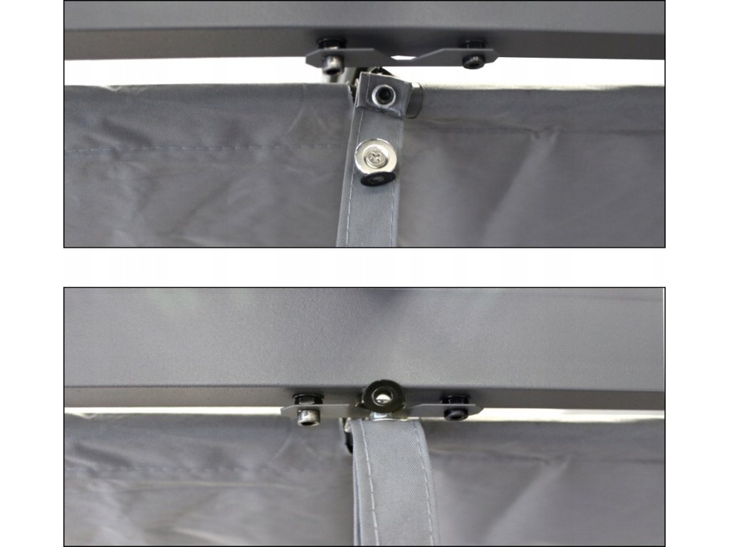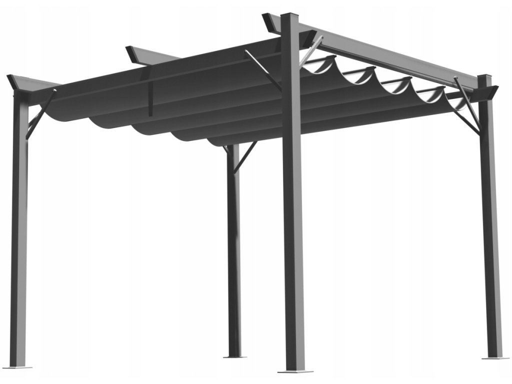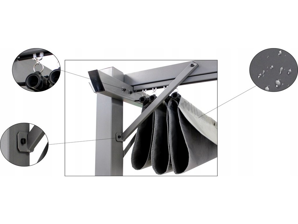 Okvir naše pergole je narejen iz prašno lakiranih jeklenih profilov, kar zagotavlja trdnost in stabilnost konstrukcije. Prevleka je narejena iz debele poliestrske tkanine z gramazo 300 g/m2, ki nudi ne le zaščito pred soncem, temveč tudi pred blagim dežjem zahvaljujoč vodoodporni konstrukciji.