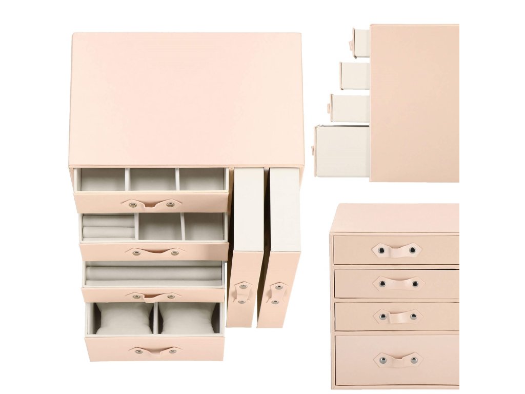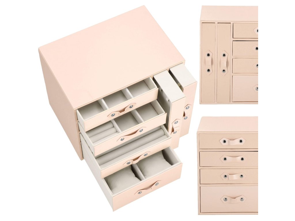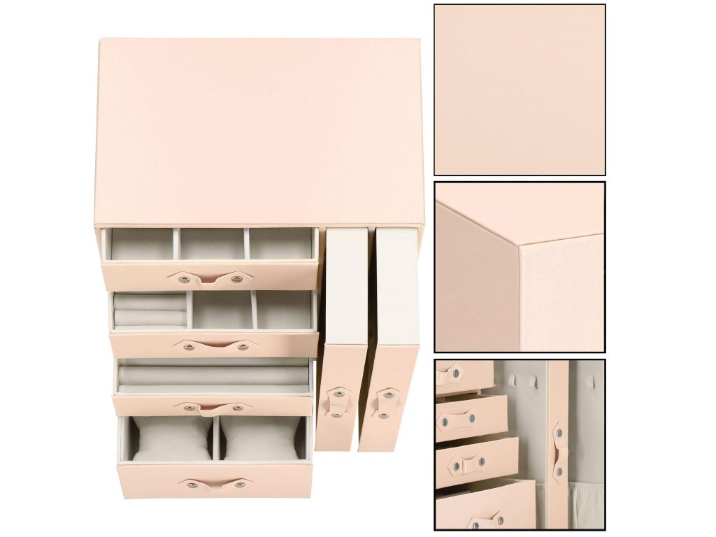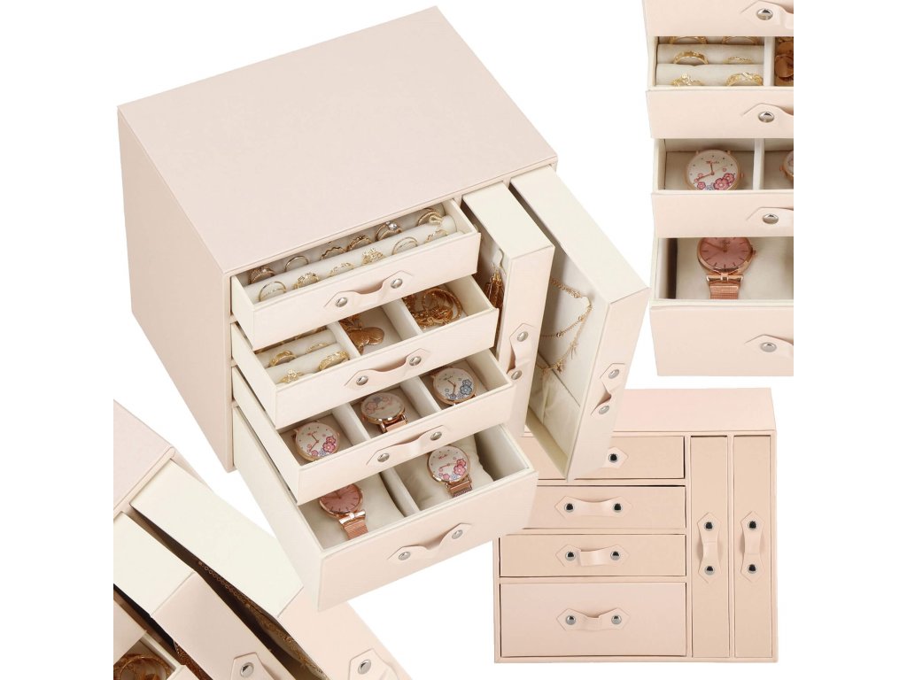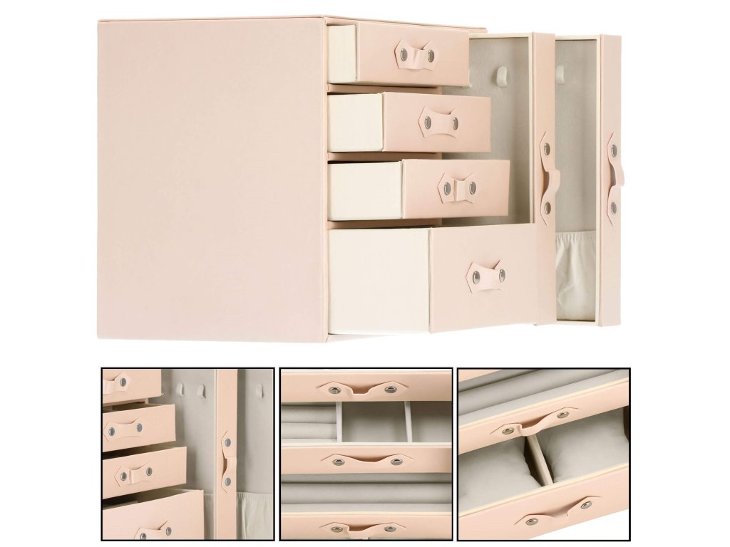 - 1 največja predal: 4 prekate z blazinicami za zapestnice / ure / dimenzije prekatov: 8 x 8 x 5 cm