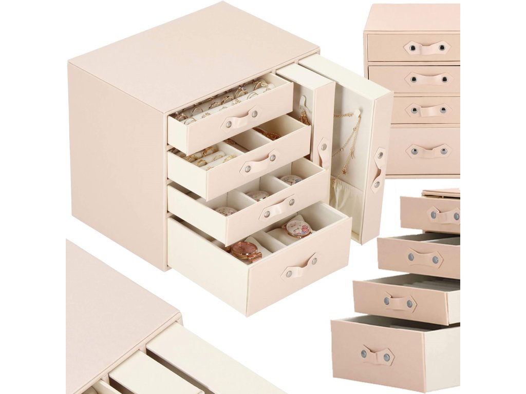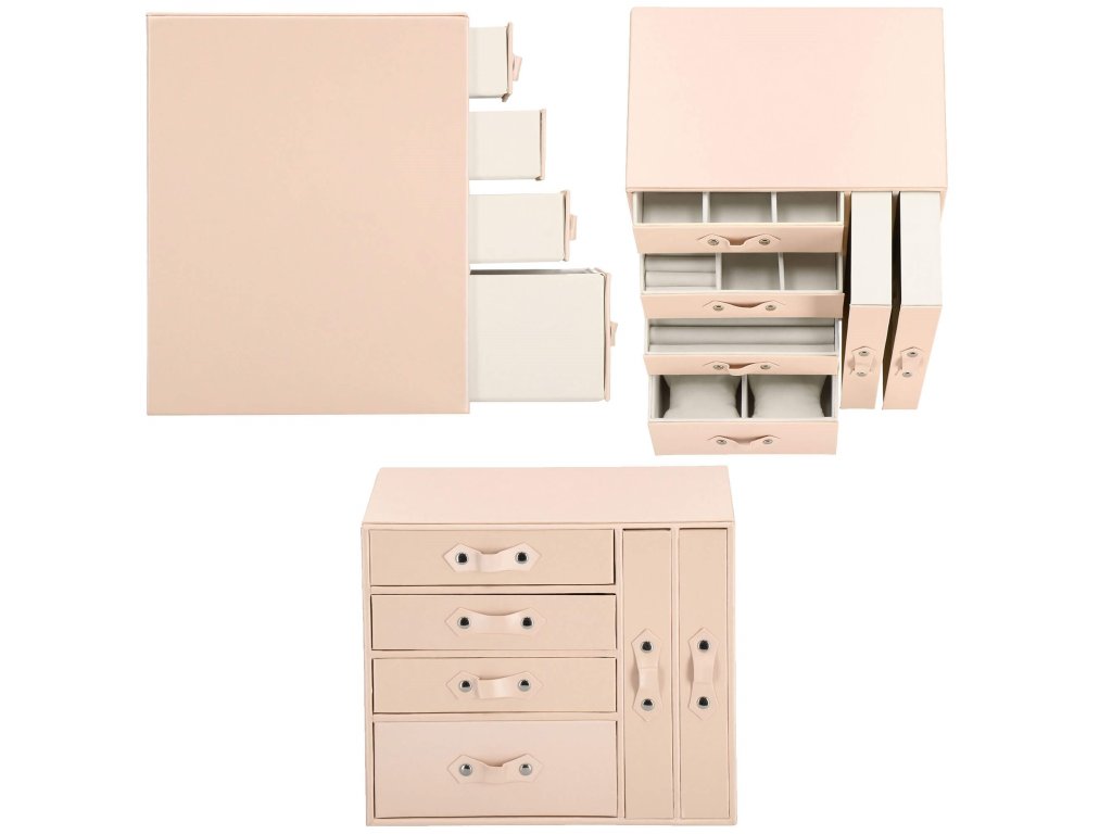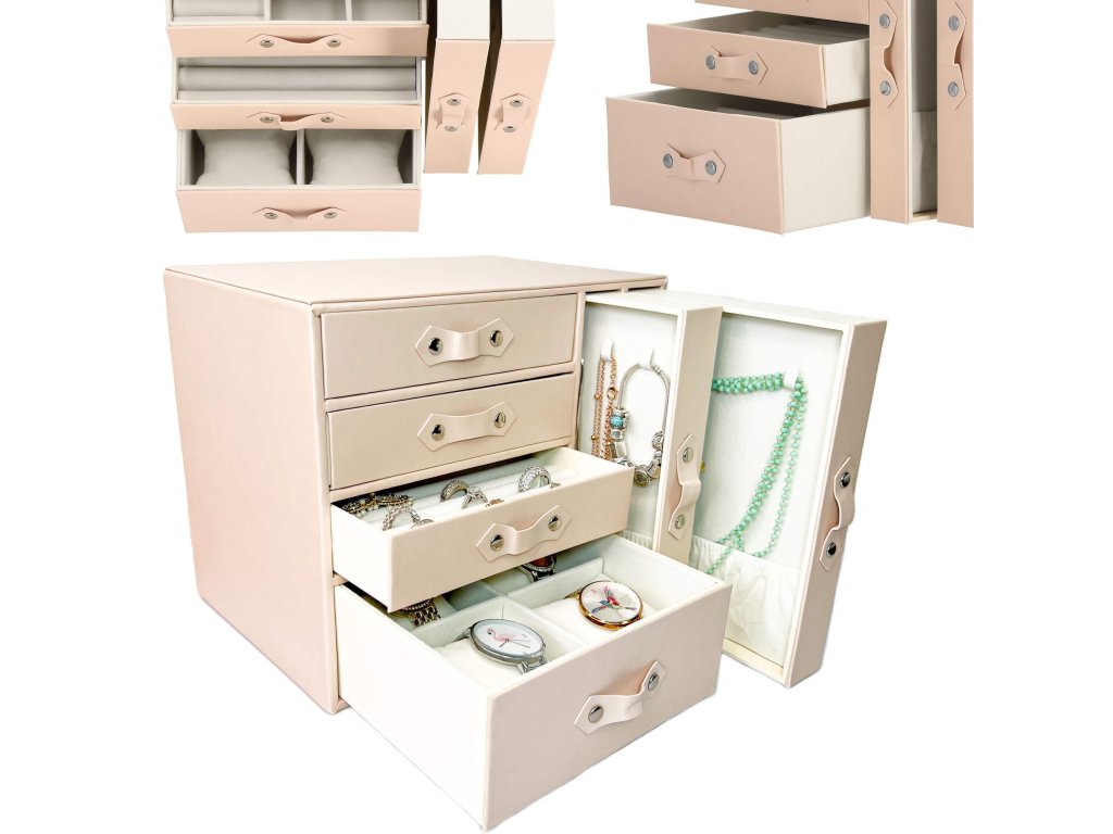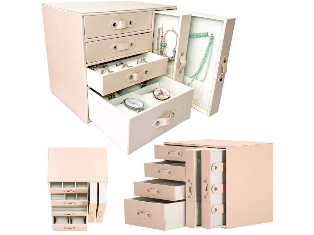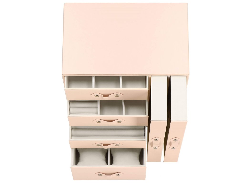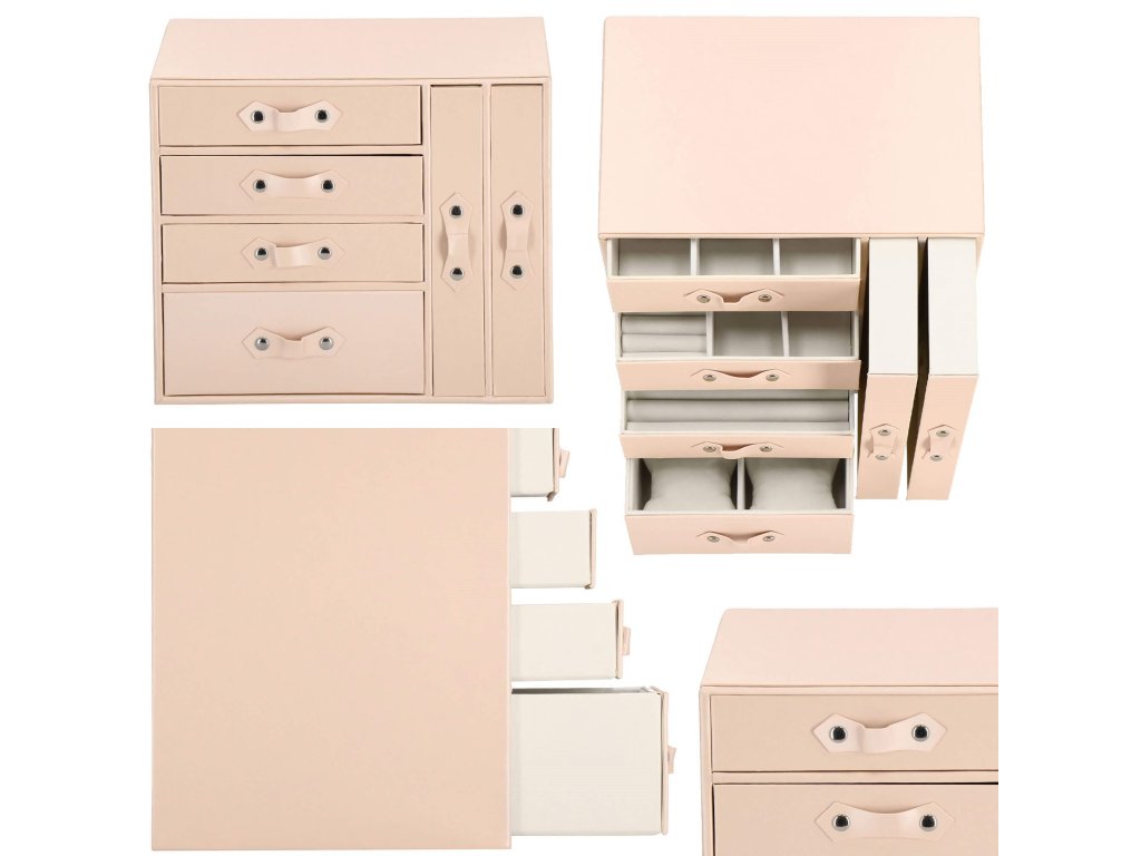 - 1 največja predal: 4 prekate z blazinicami za zapestnice / ure / dimenzije prekatov: 8 x 8 x 5 cm