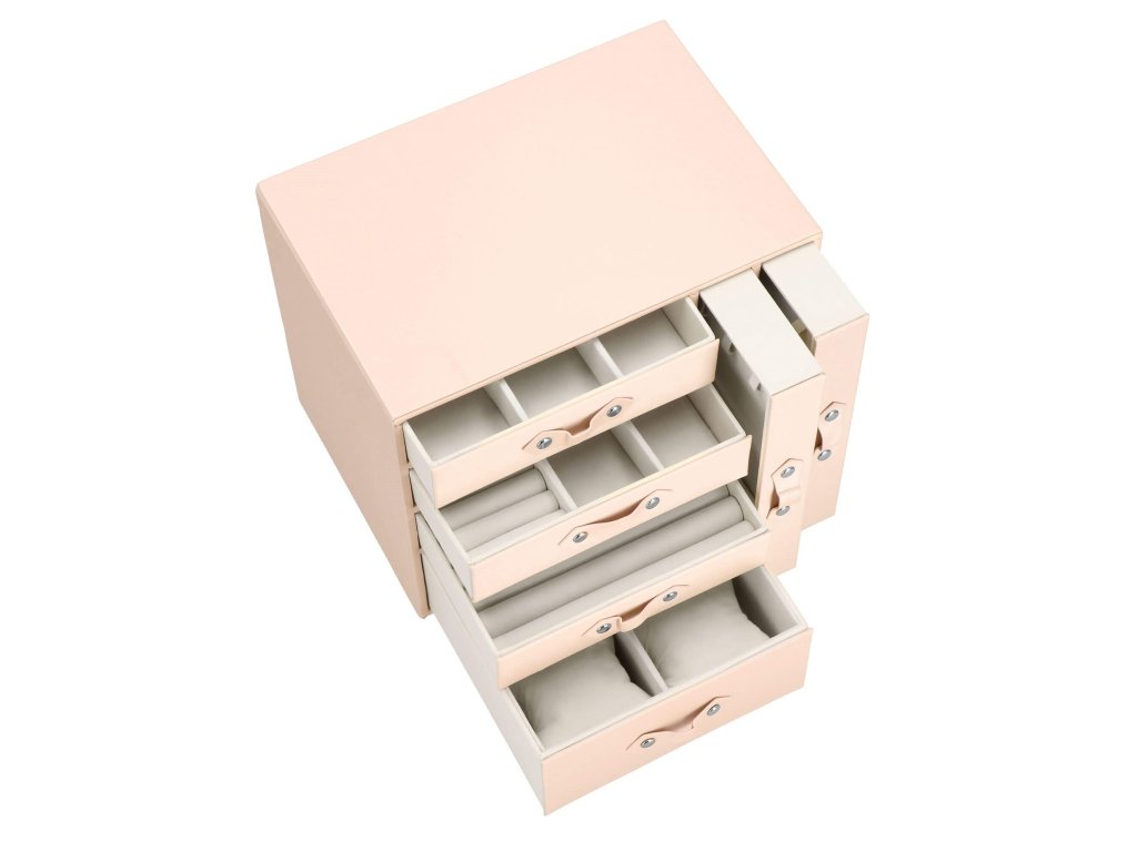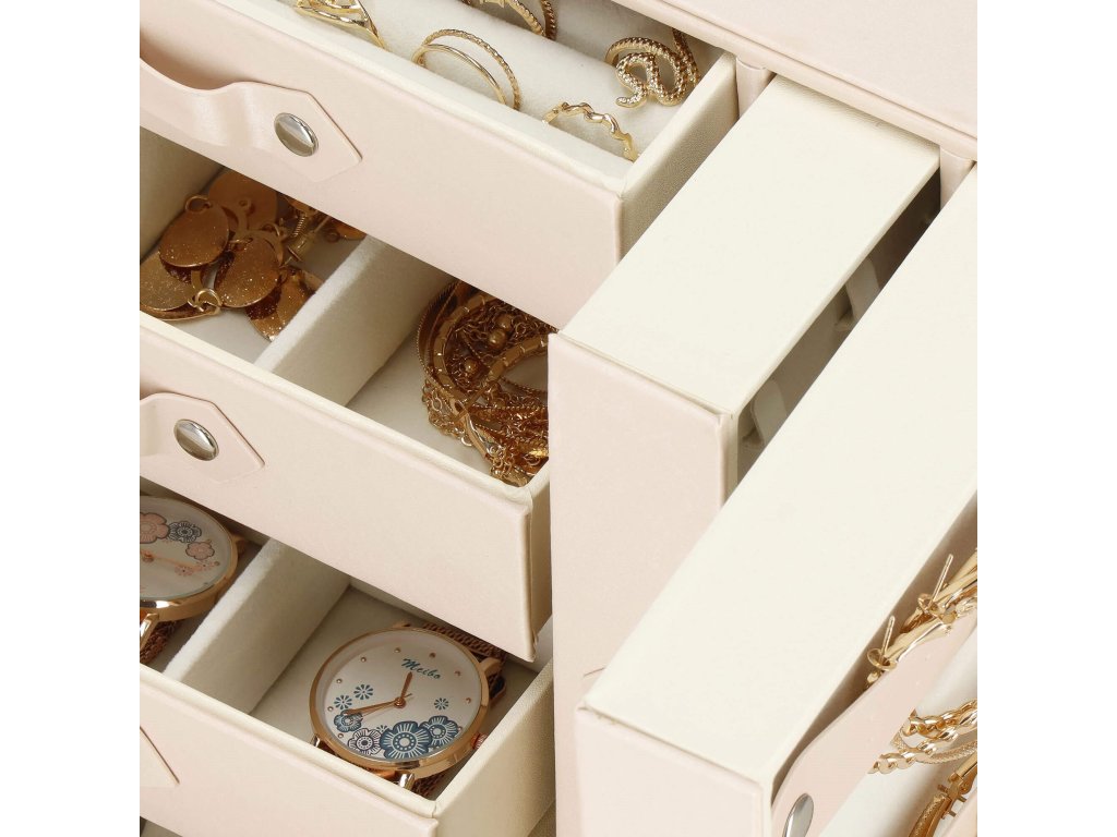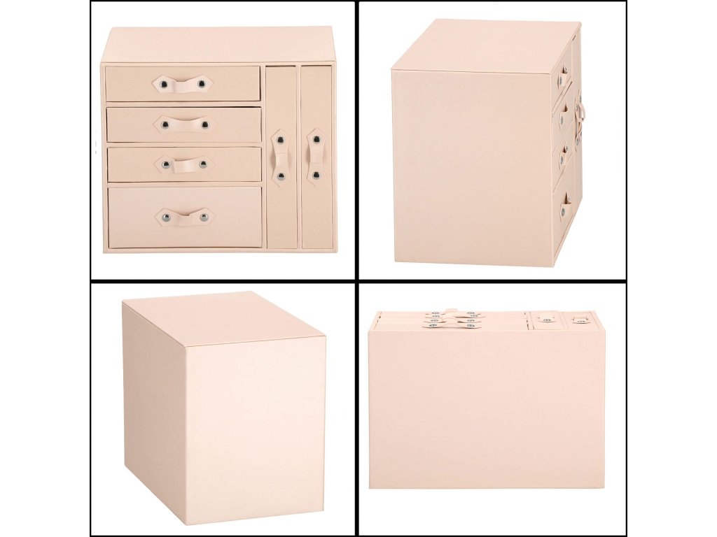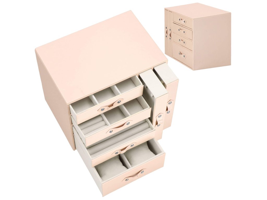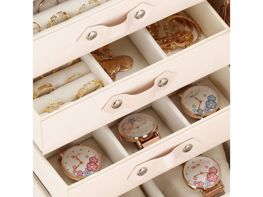 - 1 največja predal: 4 prekate z blazinicami za zapestnice / ure / dimenzije prekatov: 8 x 8 x 5 cm