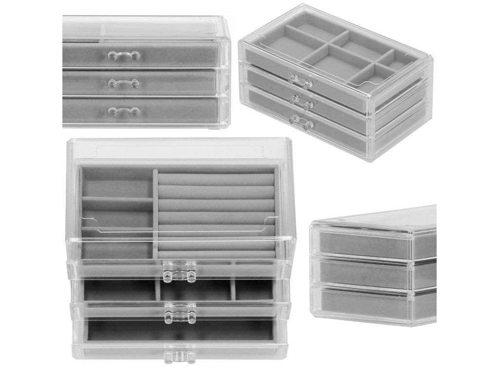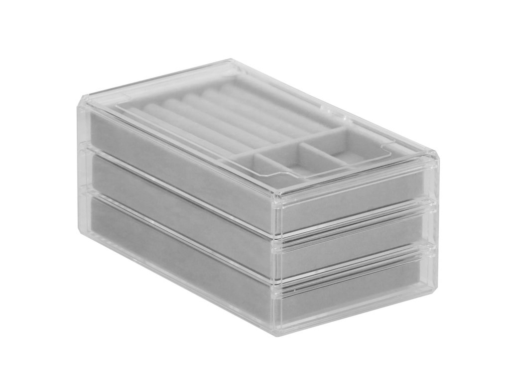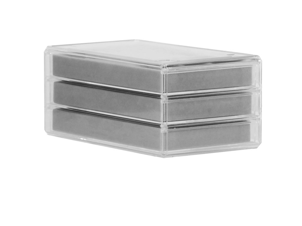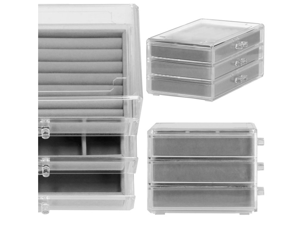 Prvi predal je razdeljen na tri predele: širina: 7,5 cm x globina: 3,5 cm in en velik predel za prstane ali verižice: širina: 12 cm x globina: 12 cm