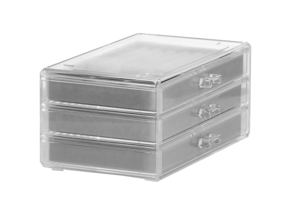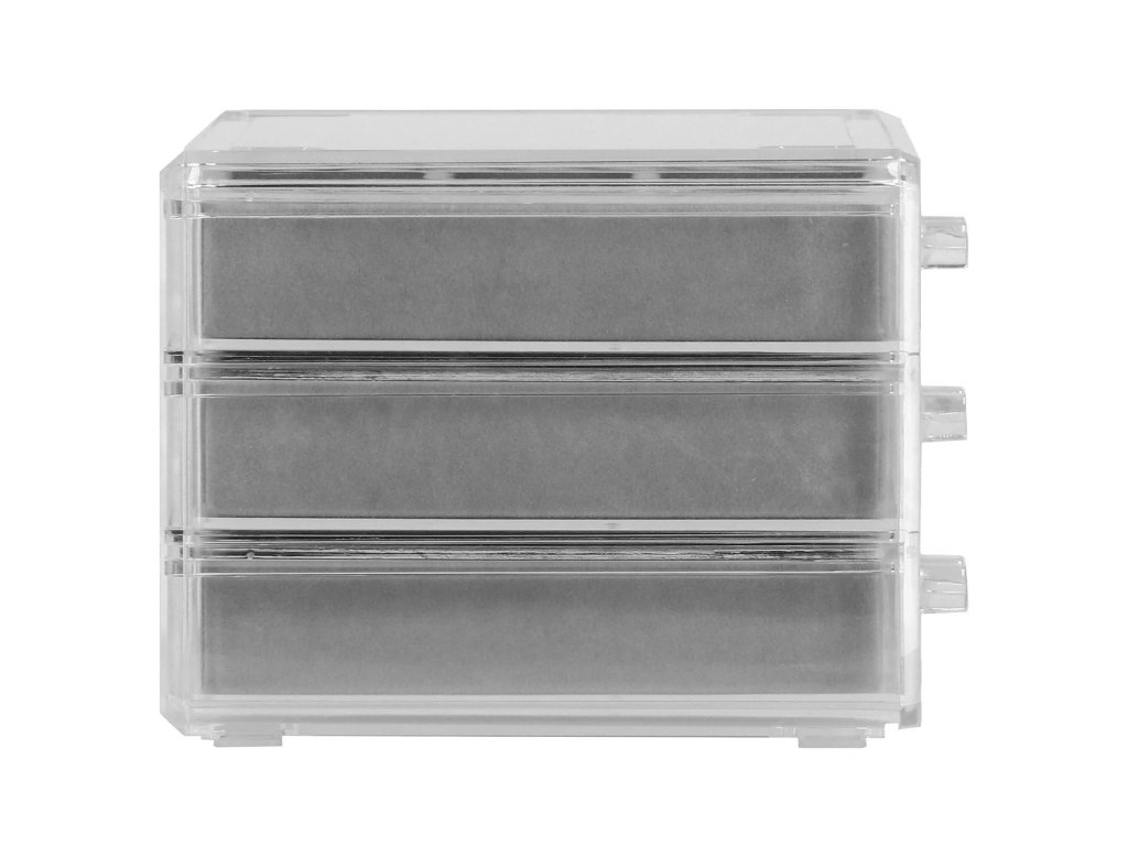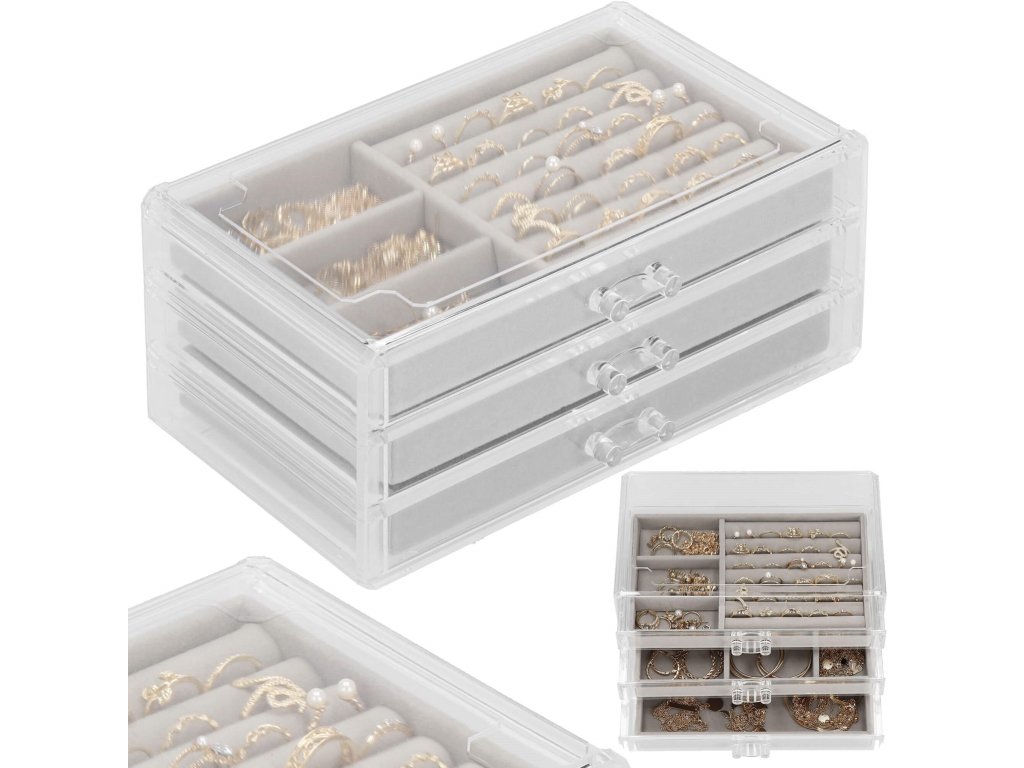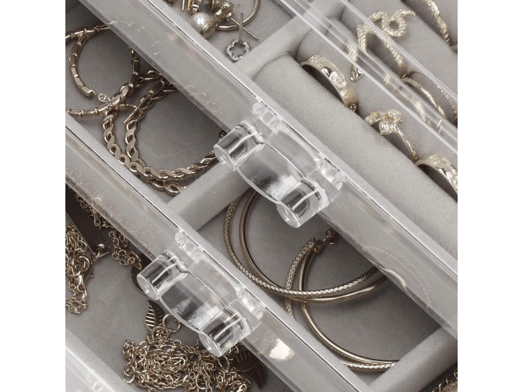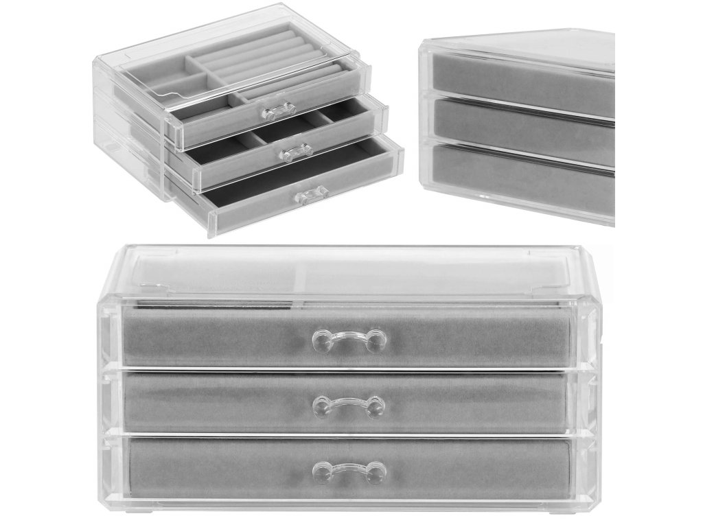 Prvi predal je razdeljen na tri predele: širina: 7,5 cm x globina: 3,5 cm in en velik predel za prstane ali verižice: širina: 12 cm x globina: 12 cm