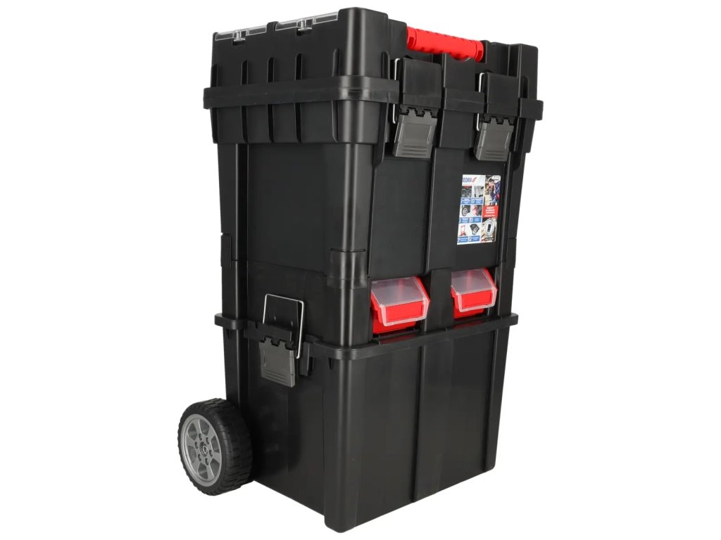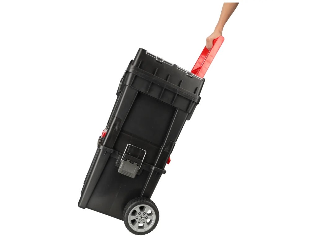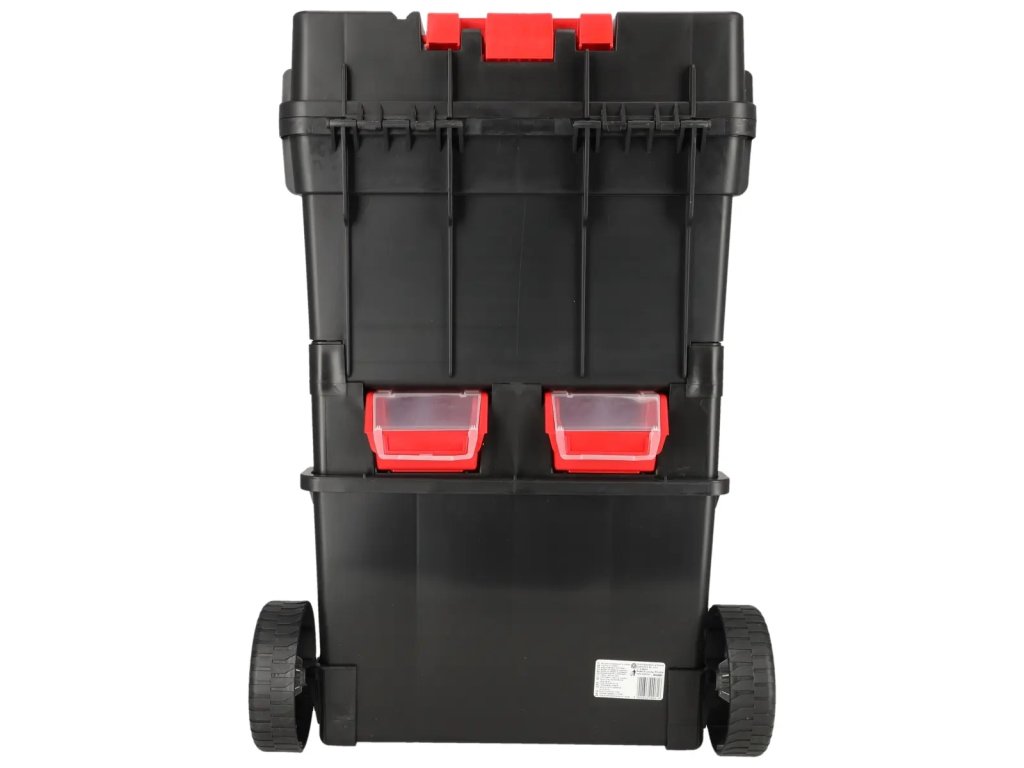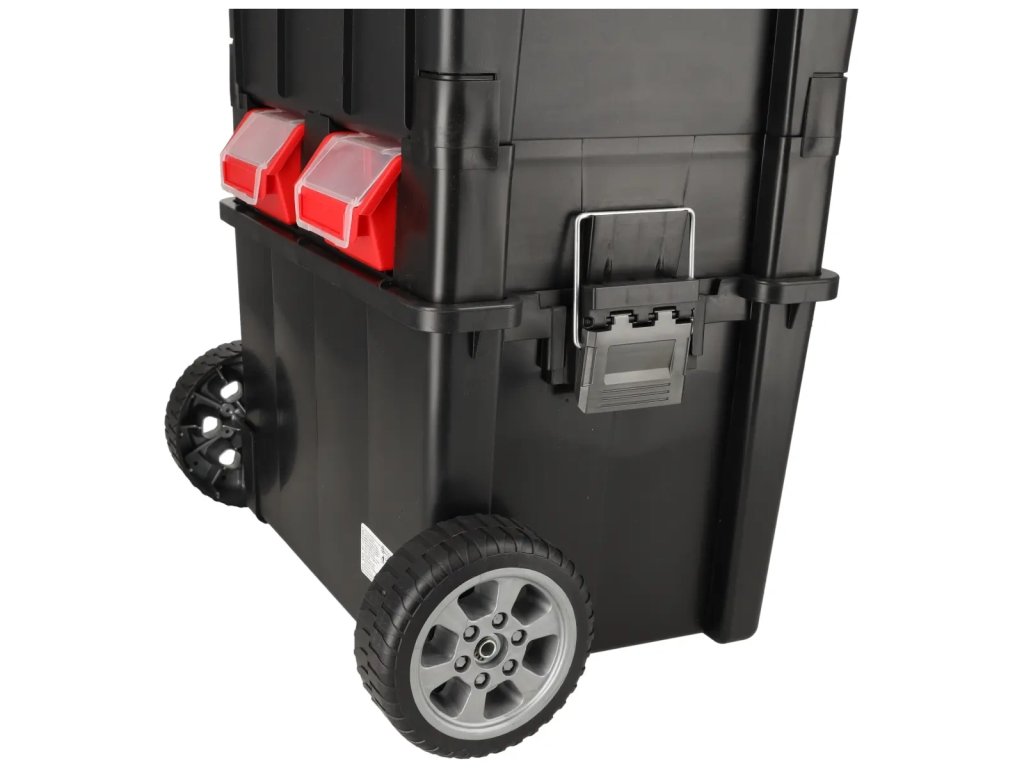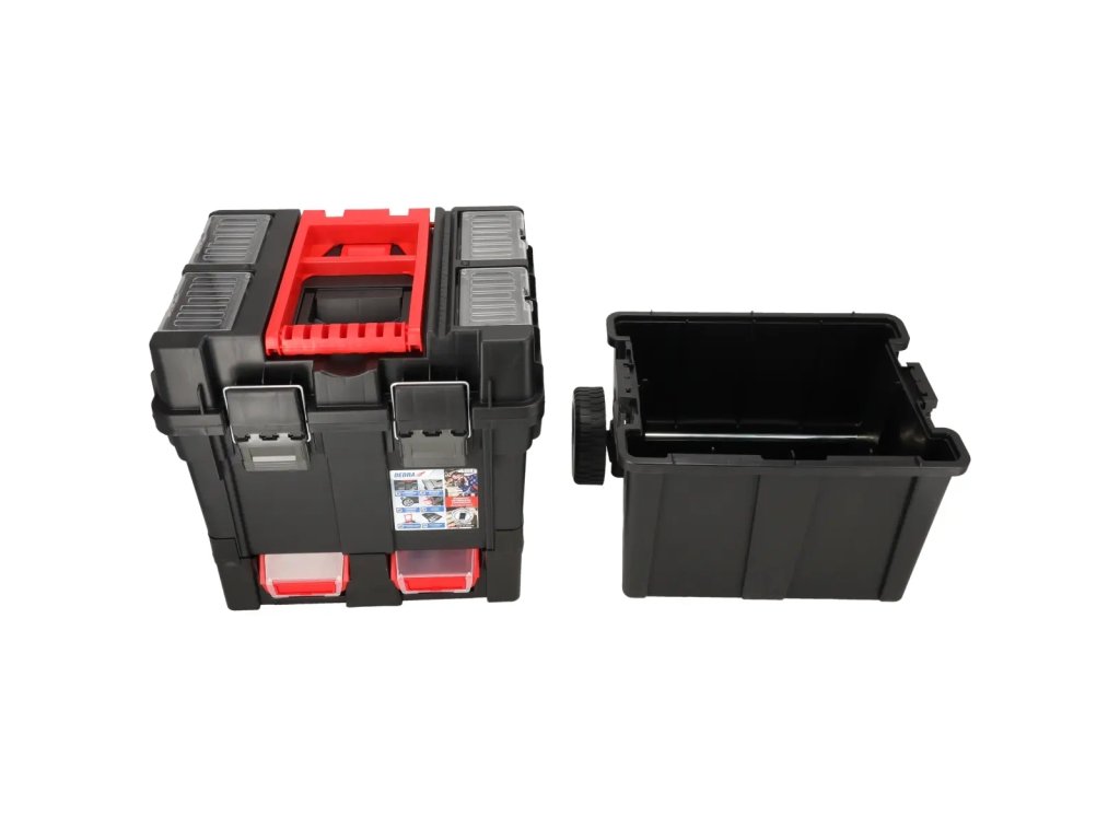 Delavnica na kolesih ima 2 komponenti - prvi je osnovni zaboj s kolesi. Prvi je osnovni zaboj s kolesi. Njegov prostoren prostor sprejme največje in najtežje p r e d m e t e. Osnovna omara je opremljena s kolesi, ki so sestavljena iz dveh delov: iz močnih obročkov/škarij in iz mehkega plastičnega materiala, ki tvori vozno površino koles. Uporaba kovinske osi bistveno poveča robustnost in vzdržljivost delavnice na kolesih. Zahvaljujoč širokemu razmiku koles voziček ostaja stabilen med prevozom, kar zagotavlja varnost za vas in vaše orodje.