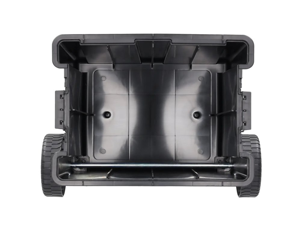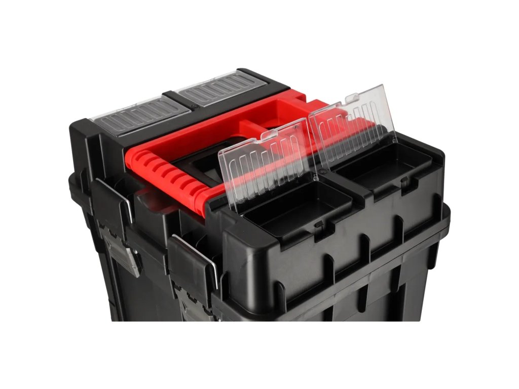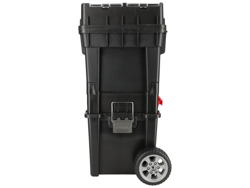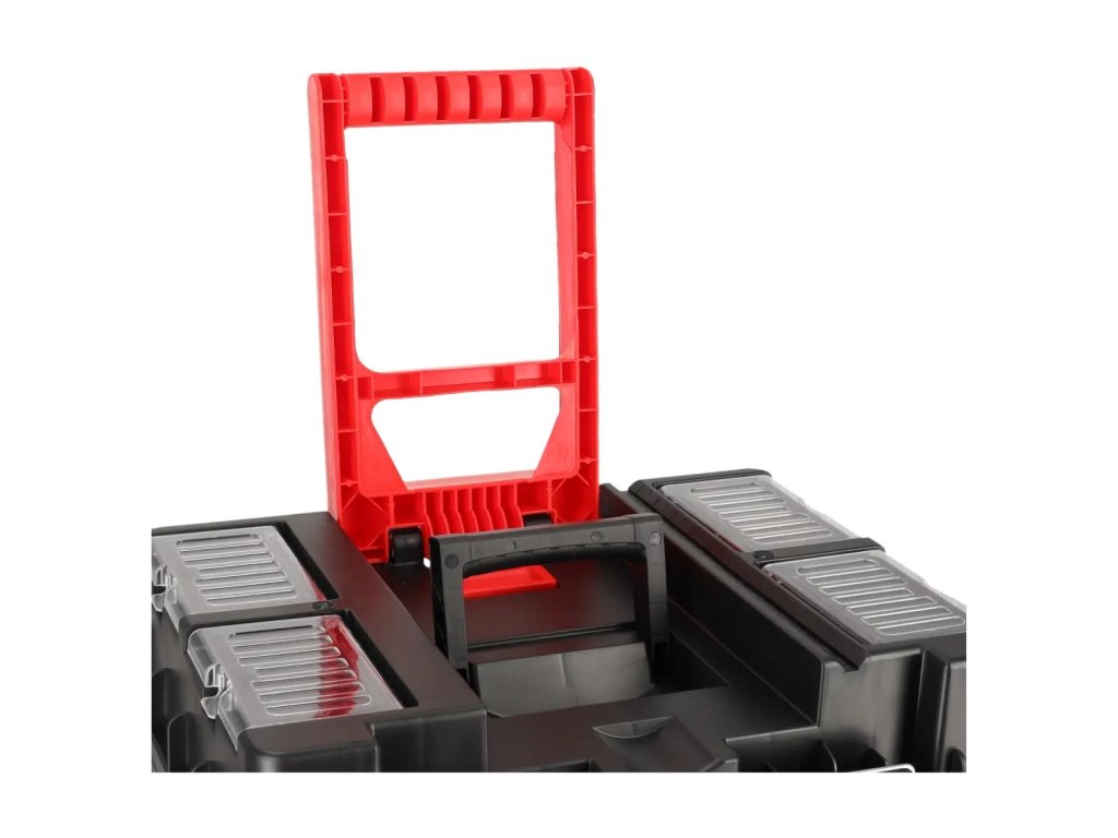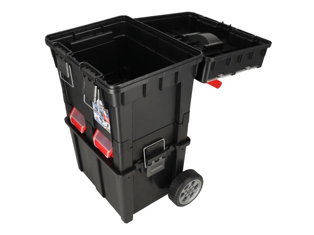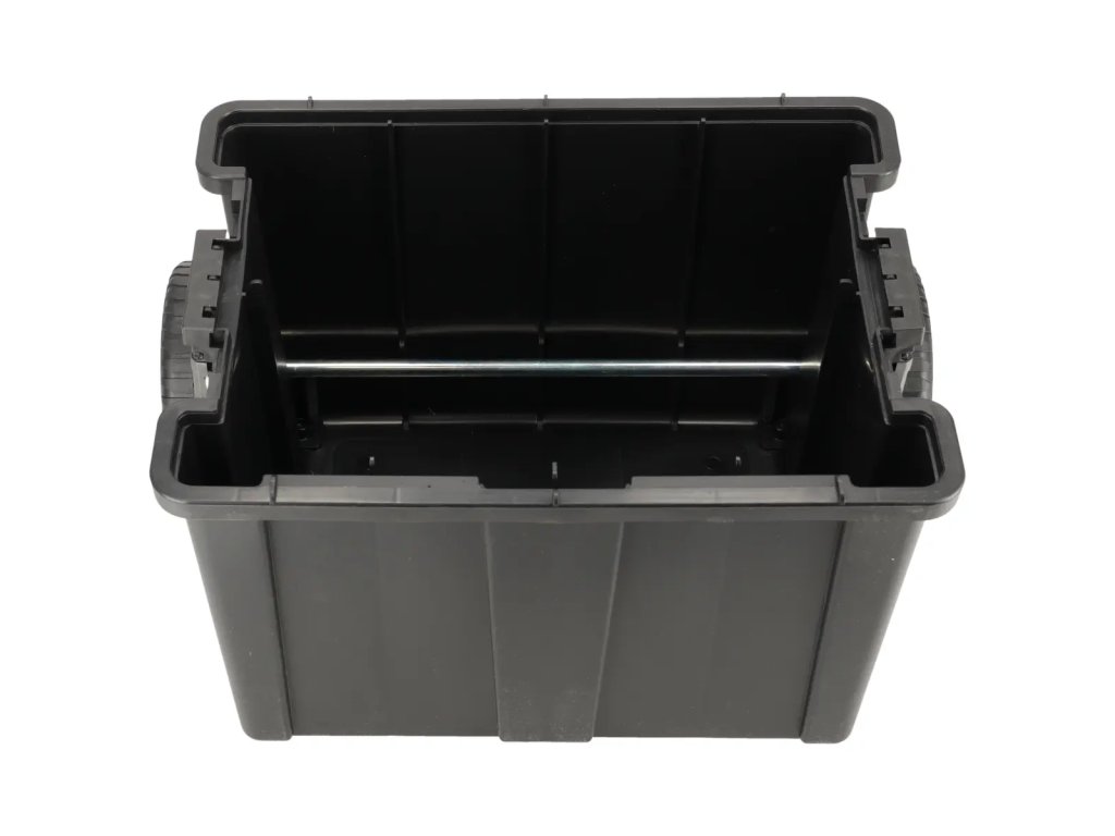 Delavnica na kolesih ima 2 komponenti - prvi je osnovni zaboj s kolesi. Prvi je osnovni zaboj s kolesi. Njegov prostoren prostor sprejme največje in najtežje p r e d m e t e. Osnovna omara je opremljena s kolesi, ki so sestavljena iz dveh delov: iz močnih obročkov/škarij in iz mehkega plastičnega materiala, ki tvori vozno površino koles. Uporaba kovinske osi bistveno poveča robustnost in vzdržljivost delavnice na kolesih. Zahvaljujoč širokemu razmiku koles voziček ostaja stabilen med prevozom, kar zagotavlja varnost za vas in vaše orodje.