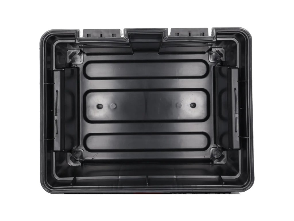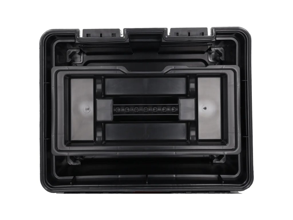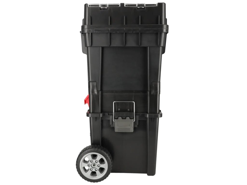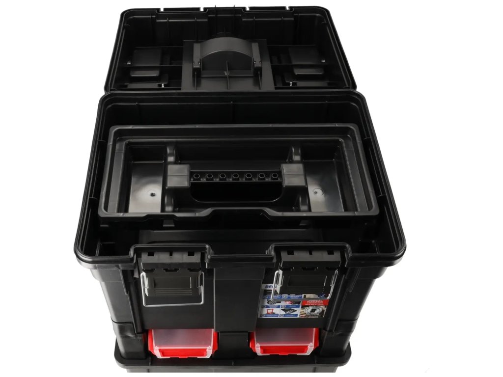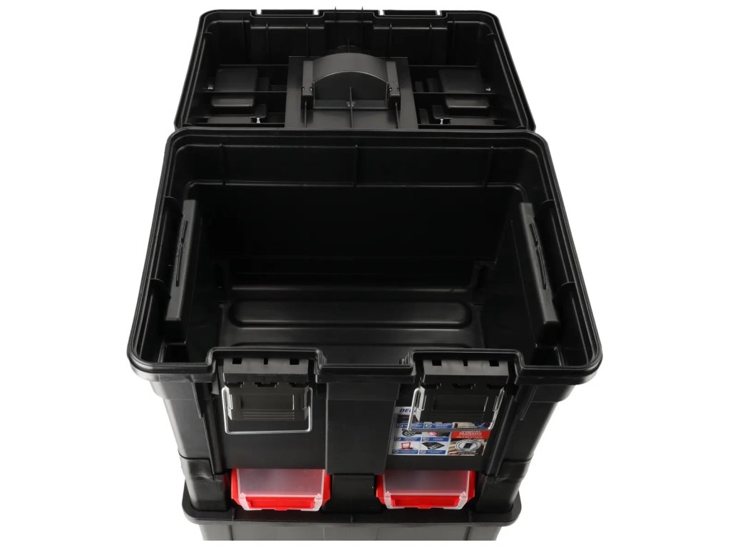 Delavnica na kolesih ima 2 komponenti - prvi je osnovni zaboj s kolesi. Prvi je osnovni zaboj s kolesi. Njegov prostoren prostor sprejme največje in najtežje p r e d m e t e. Osnovna omara je opremljena s kolesi, ki so sestavljena iz dveh delov: iz močnih obročkov/škarij in iz mehkega plastičnega materiala, ki tvori vozno površino koles. Uporaba kovinske osi bistveno poveča robustnost in vzdržljivost delavnice na kolesih. Zahvaljujoč širokemu razmiku koles voziček ostaja stabilen med prevozom, kar zagotavlja varnost za vas in vaše orodje.