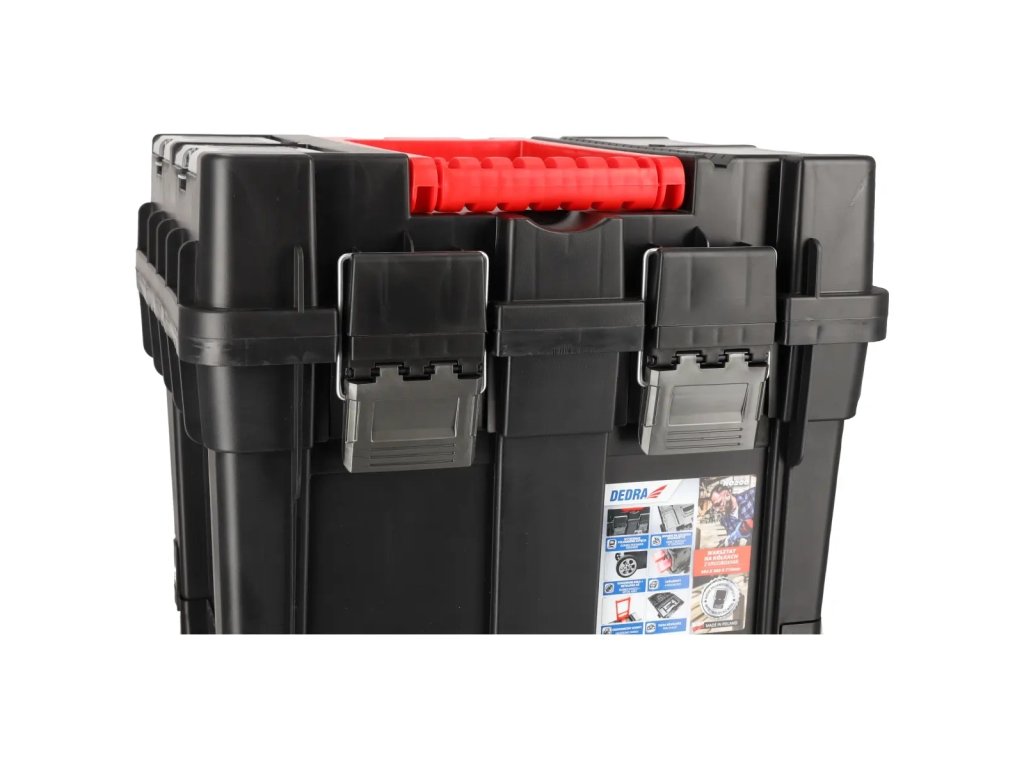 DEDRA N0200 je opremljena z dvema ročajema. Sredinski pomaga pri transportu zgornje omare. Večji rdeči ročaj, ki se nahaja na robu zaboja, omogoča varno in udobno premikanje sklopa zaboja z uporabo vgrajenih koles. Ročaj je zavarovan s premičnim zaklepom/odklopnim mehanizmom za enostavno uporabo. Ročaj se dvigne le, ko to želite. To povečuje udobje uporabnika in hkrati ščiti element pred naključno poškodbo. Stabilnost celotnega sistema zagotavljajo trdni poliamidni podstavki, odporni na kovine. Zaboji so v vogalih zavarovani proti zdrsne podložkami. To zagotavlja ne le dodatno stabilnost, temveč tudi blaži vibracije pri premikanju delavnice na kolesih in preprečuje zdrs zabojev med prevozom, na primer v avtomobilu.