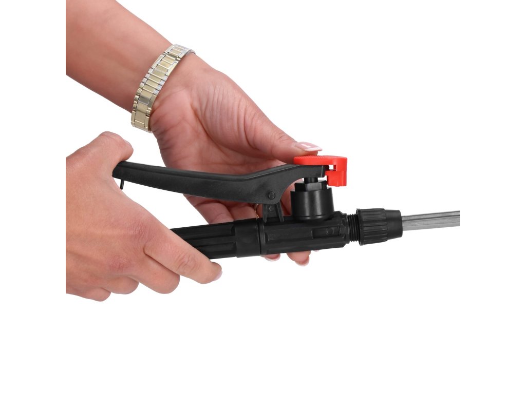 - Na ročaju je rdeč gumb, ki zaklene in odklene razpršilec