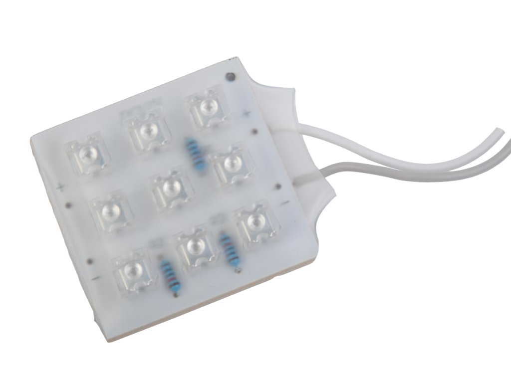 Grozdenje z 9 FLUX diodami v plastičnem ovitku (ne ščiti pred vdorom vode) Debelina modula: 2mm Delovna napetost: 12V Delovni tok: 20mA Kot svetilnosti: 100 stopinj. Delovna temperatura: -25 + 60 45 LMGrozdenje z 9 FLUX diodami v plastičnem ovitku (ne ščiti pred vdorom vode)