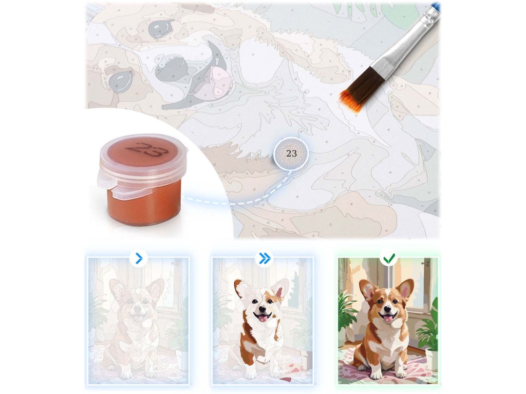 - Priredite barvo s številko: vsako področje na platnu ima dodeljeno številko, ki ustreza določeni barvi iz kompleta.