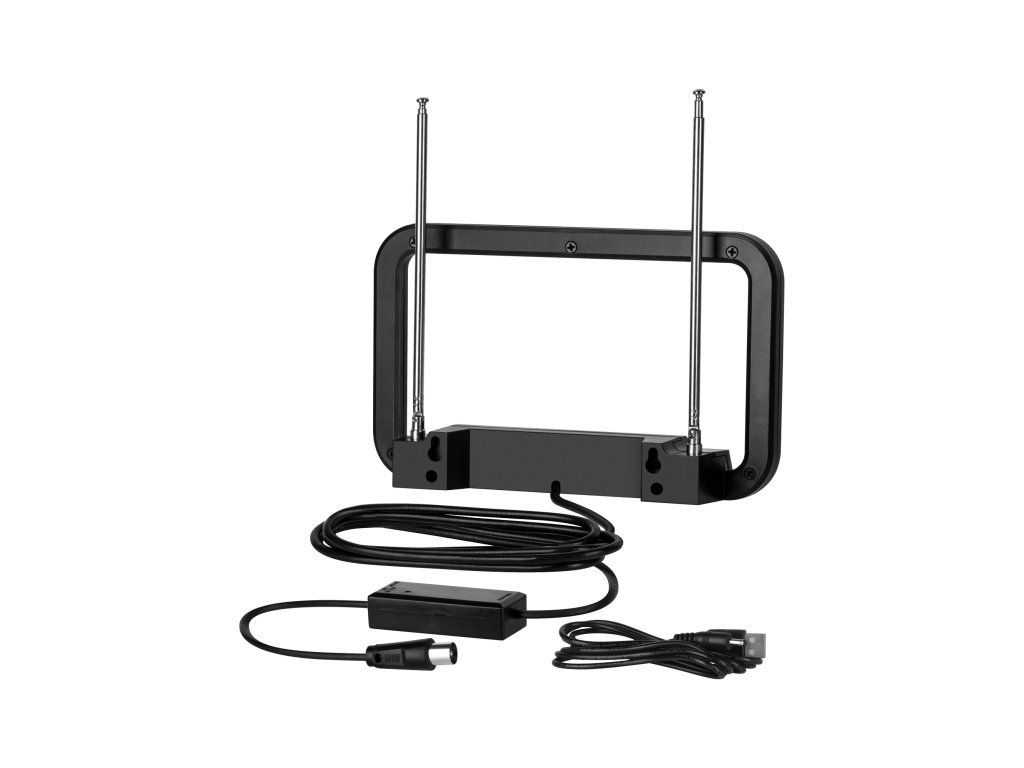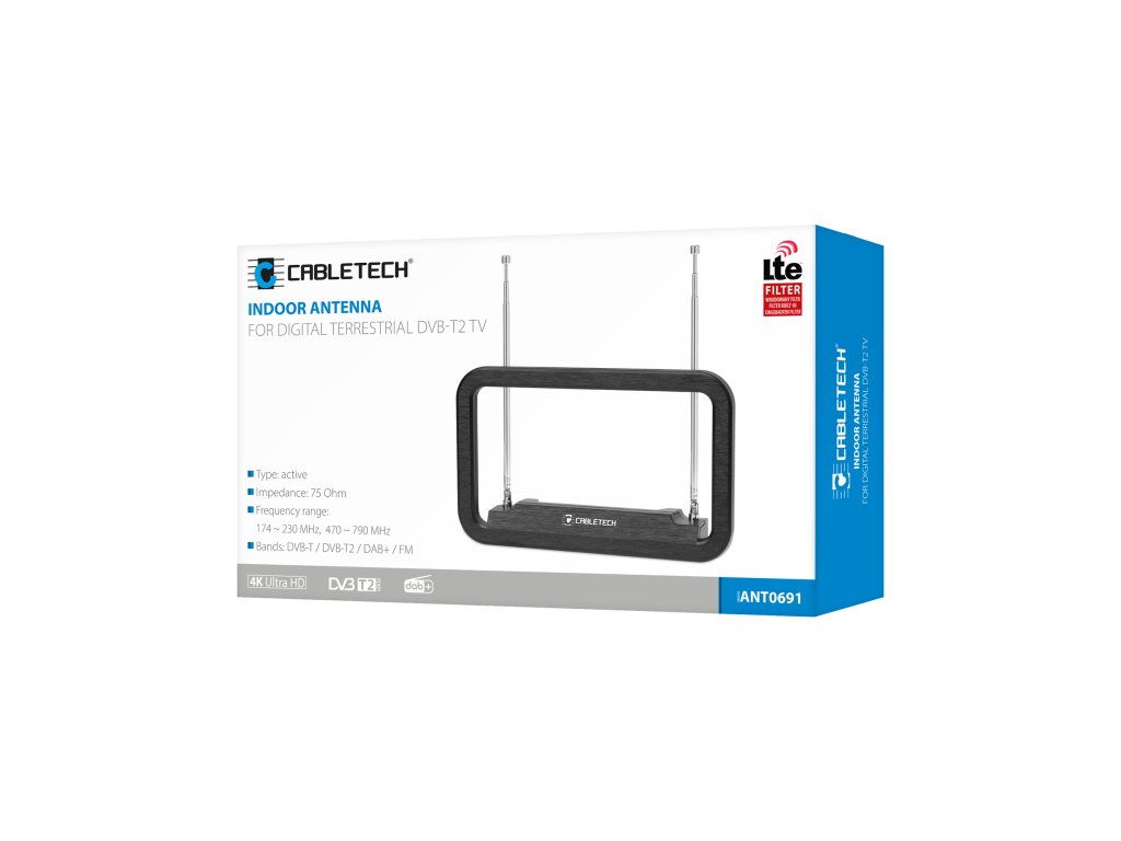 ---------- Glavni parametri ---------- Frekvenčni razpon: (VHF) 174-230 MHz, (UHF) 470-790 MHz Pasovi: DVB-T / DVB-T2 / DAB+ / FM Kanali: 5-12; 21-60 Impedanca: 75 Ohm Dobitek: (VHF) 25 dB, (UHF) 24 dB Maks. izhodna raven: 100 dBuV Raven šuma: < 3 dB Polarizacija: Navpična / Vodoravna LTE filter: Da Združljivost s standardom 4K: Da Domet antene: Do 30 km Material: Železo + ABS Tip: Aktivna sobna Dimenzije: 20,5 x 12,6 x 3,35 cm Barva: Črna Napajanje: • preko USB: 5 V, 50 mA • iz DVB-T tunerja: 5 V, 40 mA V paketu: antena kabel (1,8 m) z ICE priključkom, USB kabel (1/4-3/4 - USB; 1,5 m) ---------- Lastnosti izdelka ---------- Prilagojena za sprejem analogne in digitalne zemeljske TV - DVB-T Sprejema digitalni televizijski signal 4K, signale VHF in UHF Primerna za vodoravne in navpične signale Vgrajen ojačevalnik za visok dobitek in nizko raven šuma Napajanje iz USB ali tunerja Ekranizacija za minimizacijo motenj Združljiva z HDTV signalom digitalne zemeljske televizije (DVB-T, DVB-T2, ISDB-T, DMB-T/H, ATSC) ter z radijskim signalom DAB / FM----------