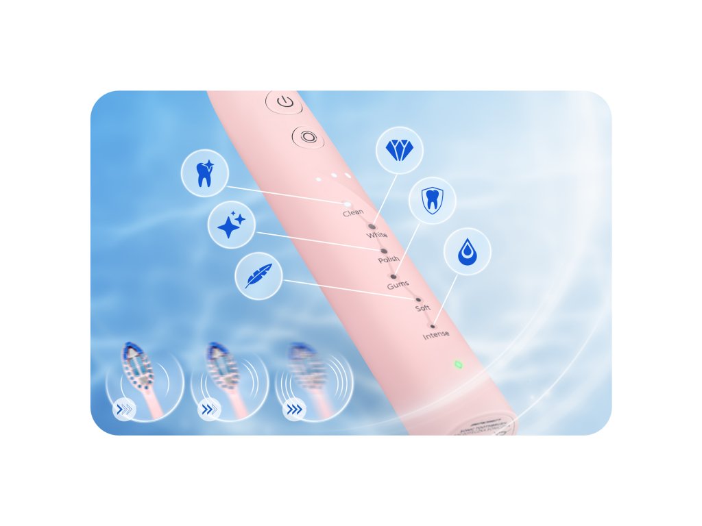 - SOFT – Nežen način: idealen za ljudi z občutljivimi zobmi in dlesnimi, zagotavlja nežno čiščenje.