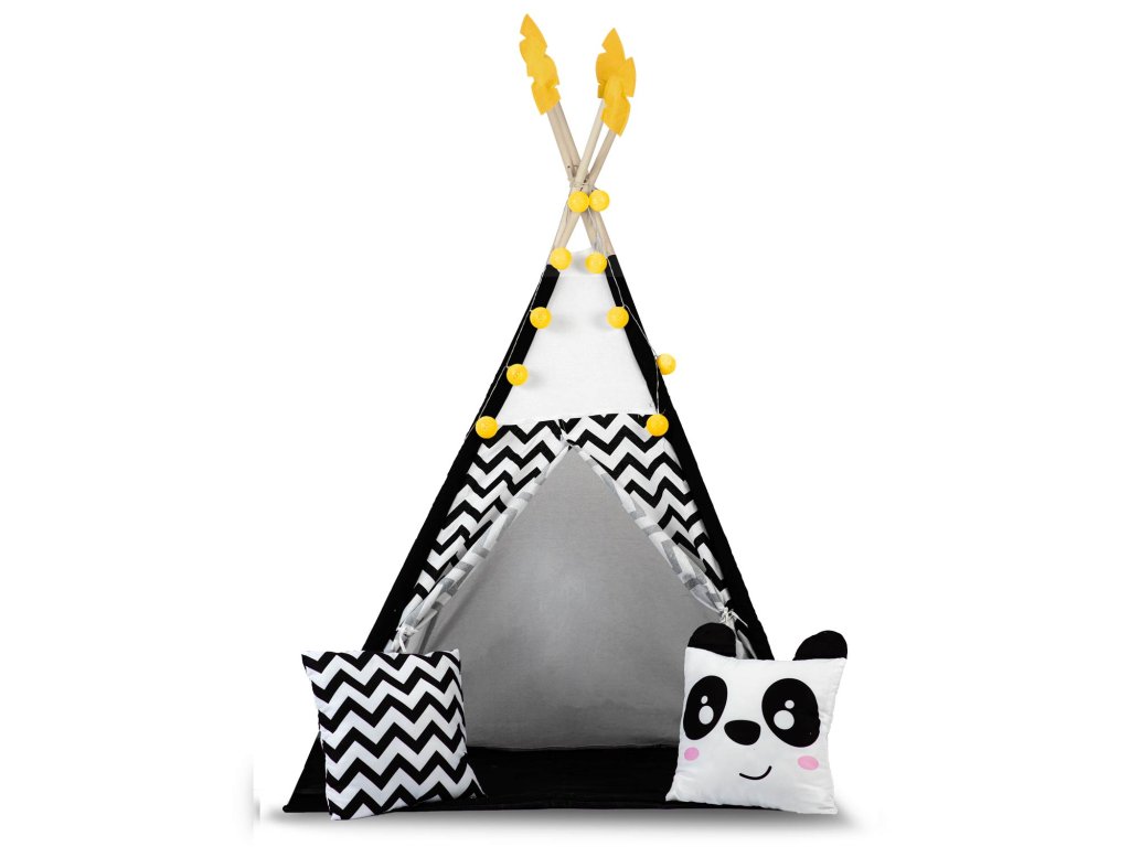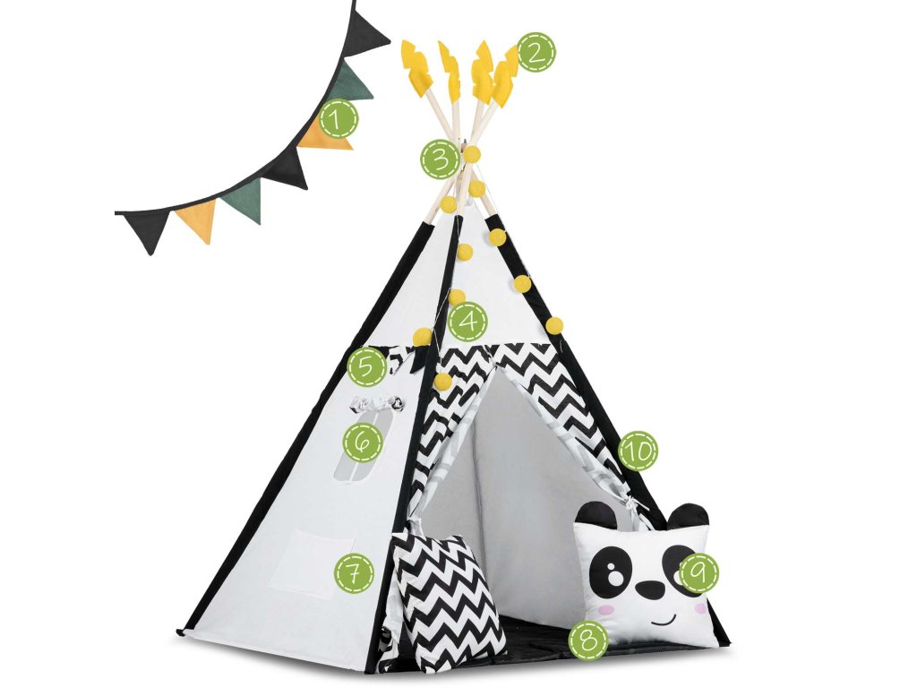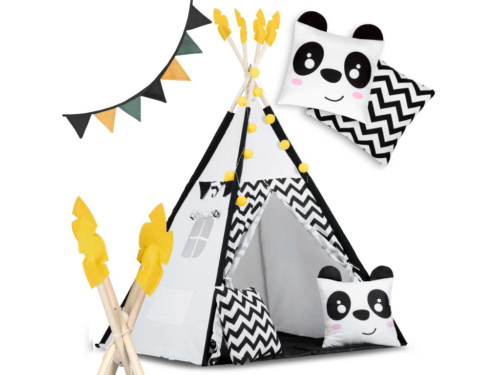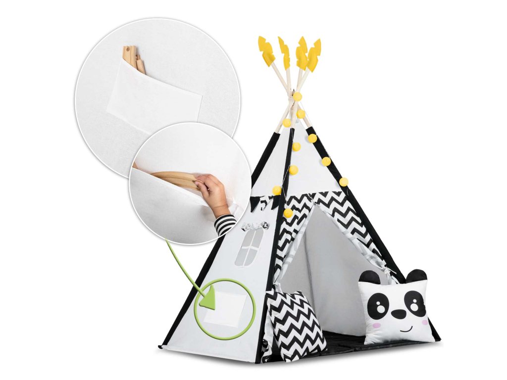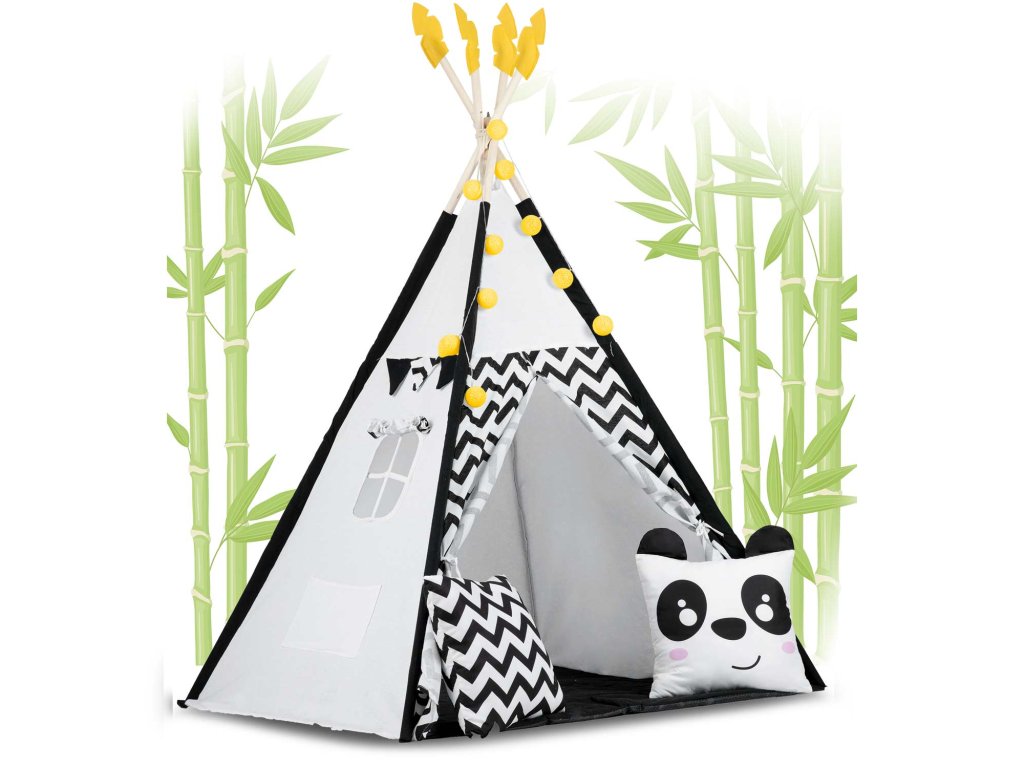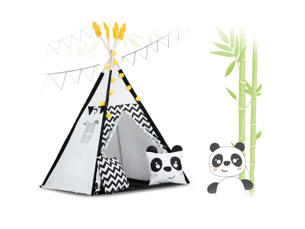 Šotor teepee za otroke z girlandami in lučkami Nukido bela črna s pando