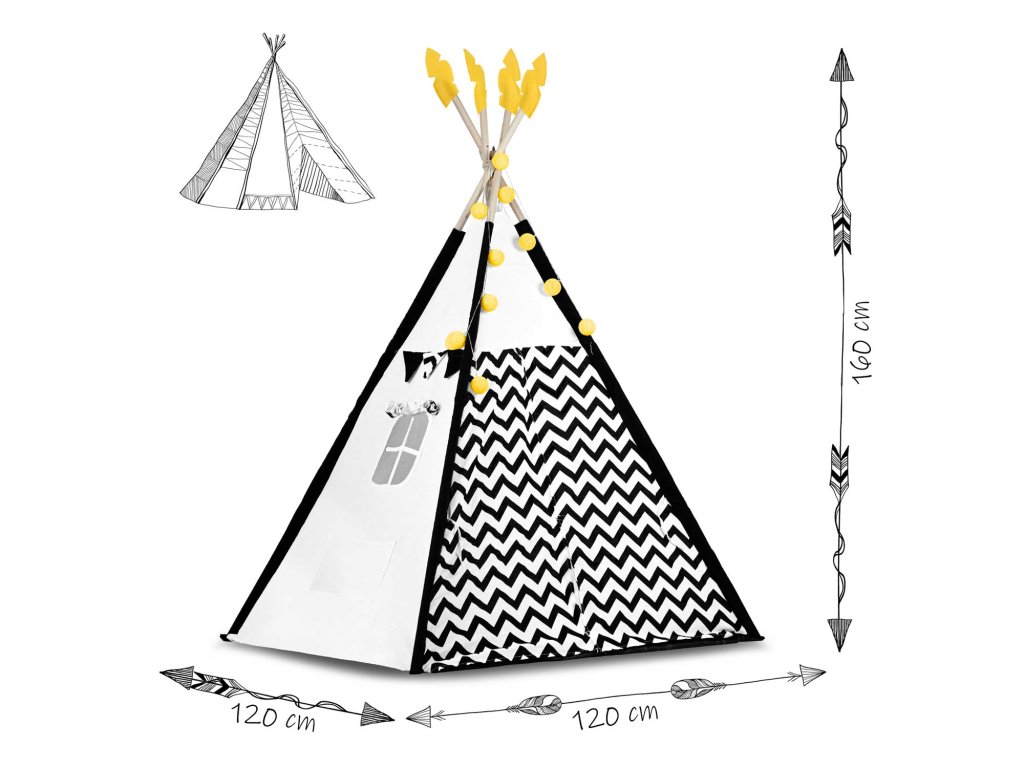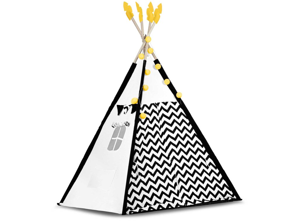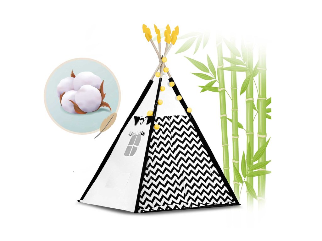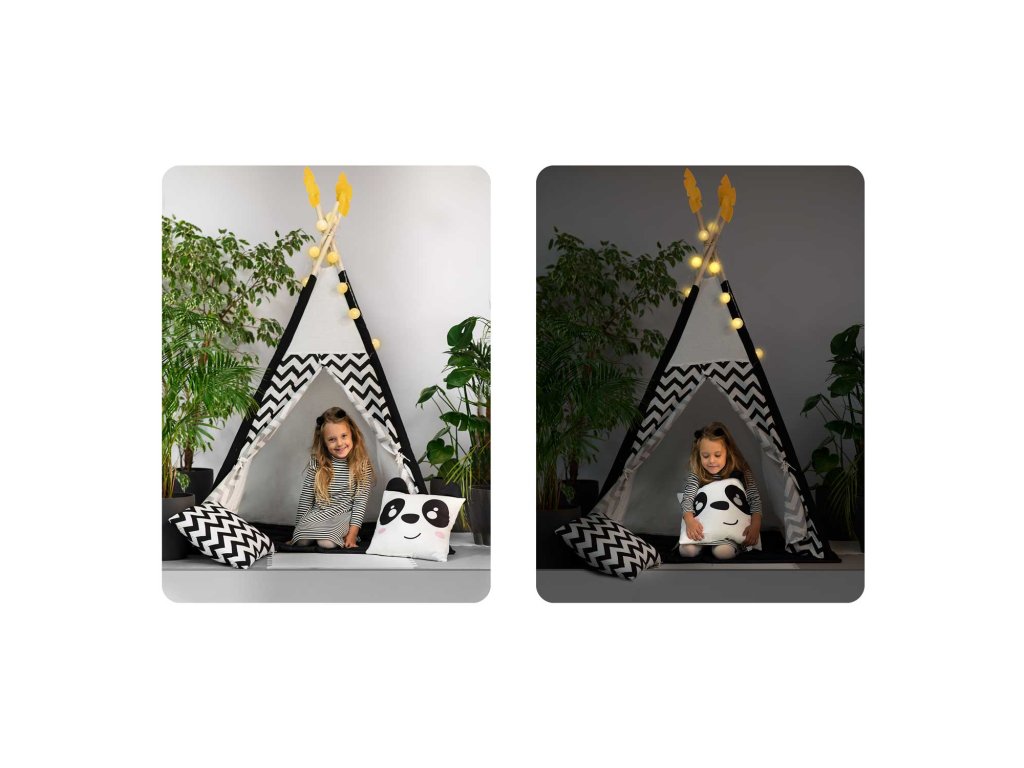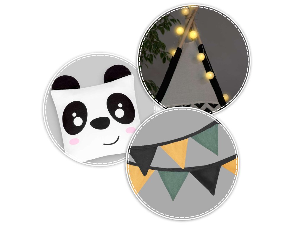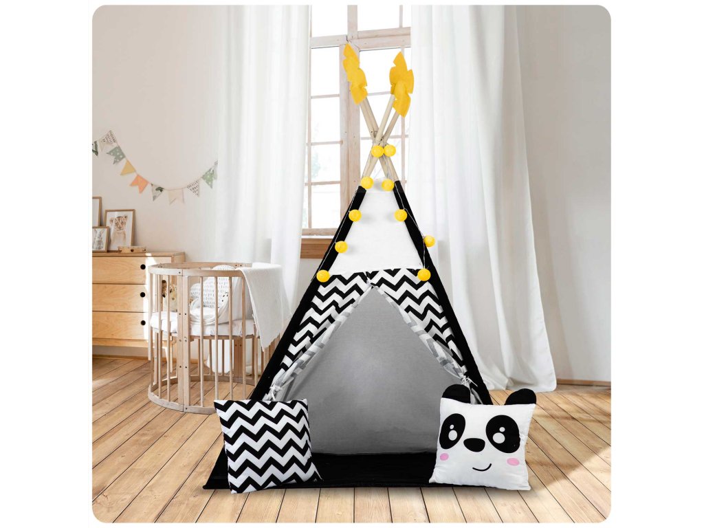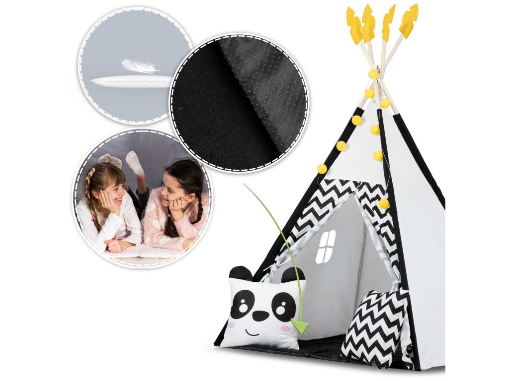 Šotor teepee za otroke z girlandami in lučkami Nukido bela črna s pando