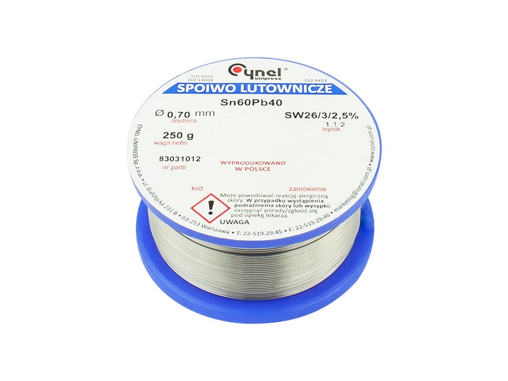 Stop S-Sn60Pb40 proizveden v prvem taljenju kositra in svinca, v neprekinjenem procesu litja brez dostopa zraka, nato stiskan, kar zagotavlja odpravo oksidov. Spajkalna zlitina CYNEL se uporablja predvsem v elektronski industriji za proizvodnjo standardnih naprav in elektronskih komponent, elektrotehnike ter za spajkanje elementov s kositrnimi, svinčevo-kositrnimi, kadmijevimi, cinkovimi in srebrnimi premazi.SPECIFIKACIJA:
