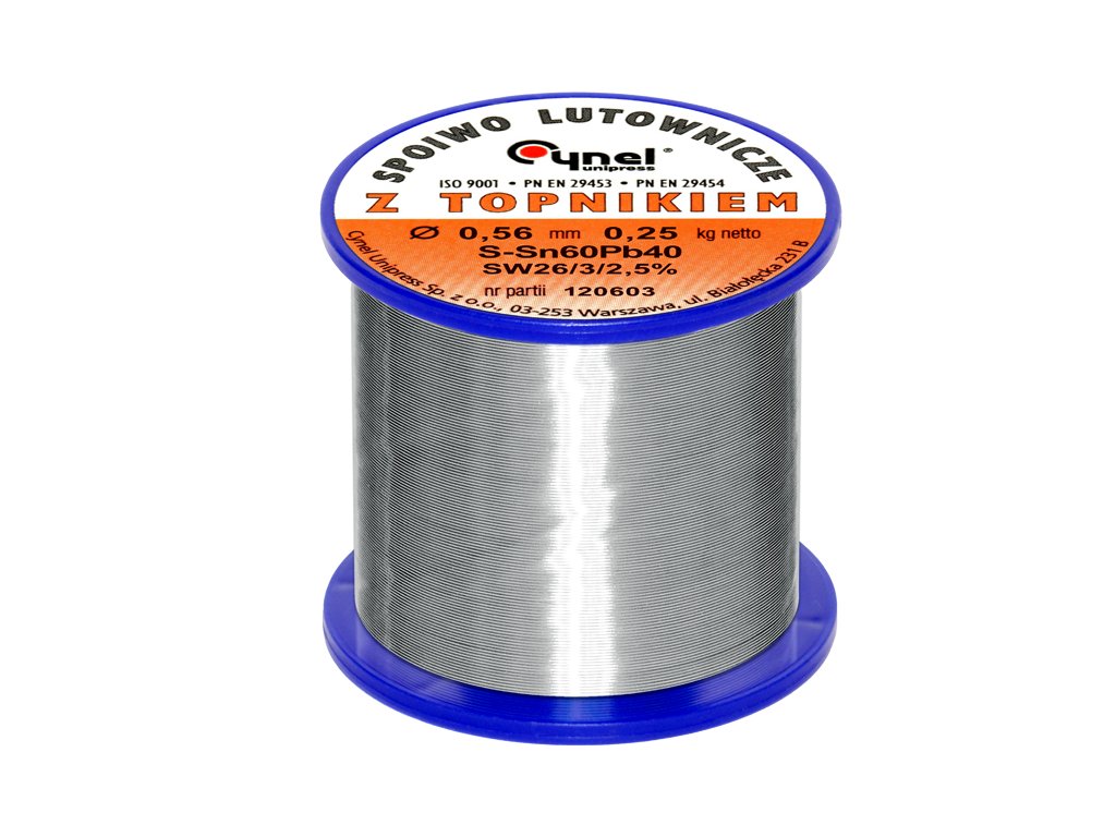 Stop Sn60Pb40, proizveden v prvem taljenju kositra in svinca v kontinuiranem livarskem procesu brez dostopa zraka, nato ekstrudiran, kar zagotavlja odpravo oksidov. Spajkalno vezivo CYNEL se uporablja predvsem v elektronski industriji, za proizvodnjo standardnih naprav in elektronskih komponent, v elektrotehniki ter za spajkanje elementov s kositrnimi, kositrno-svinčevimi, kadmijevimi, cinkovimi in srebrnimi prevlekami.SPECIFIKACIJA: