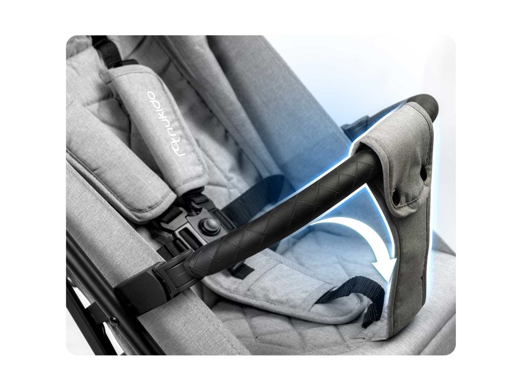 Nastavljiva varnostna pregrada - Ta pregrada zagotavlja dodatno zaščito pred nesrečnim padcem otroka iz vozička. Zlahka jo je mogoče odklopiti ali premakniti, kar olajša nalaganje in razkladanje otroka iz vozička.