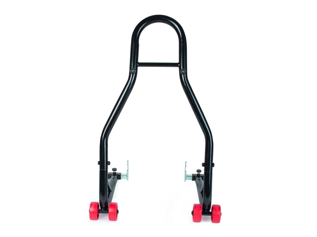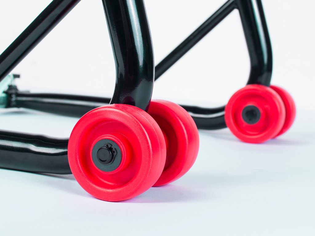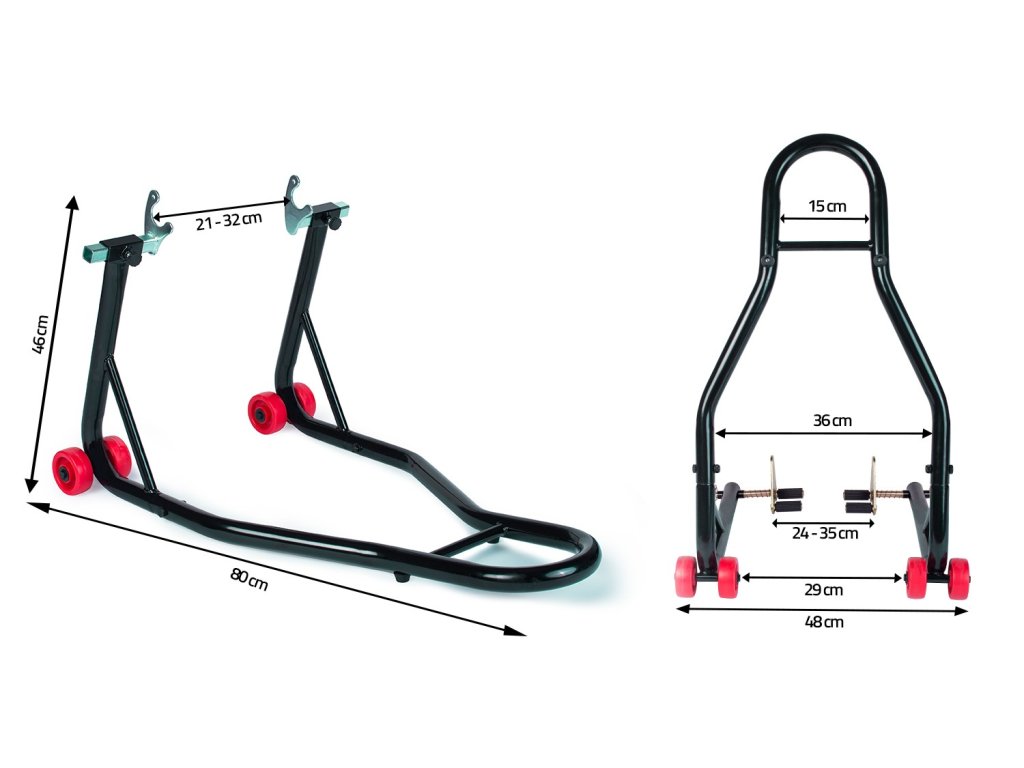 Stojalo ima nastavljive adapterje. Ta model je visok 46 cm in dolg 80 cm. Je idealen za majhne prostore, kjer je pomemben vsak košček prostora. Opremljen je z dvojnimi, dodatno ojačanimi kolesi. To je idealen način za shranjevanje motornega kolesa ali izvajanje servisnih del! Komplet vsebuje dva kosa.