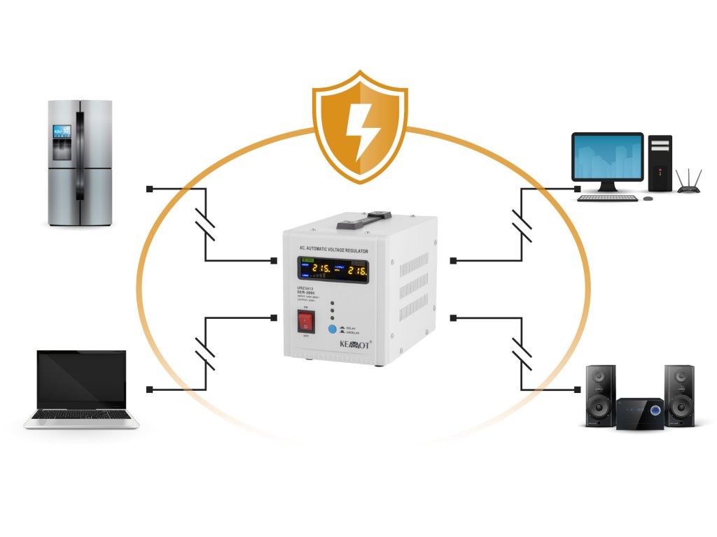 Ne glede na obremenitev omrežja in nihanja izhodne napetosti stabilizator KEMOT SER-2000 ohranja napetost na ravni 230 V ±5%, kar omogoča učinkovito delovanje vseh naprav, vključno s tistimi, občutljivimi na kakovost omrežne napetosti. Regulacija poteka samodejno, kar zagotavlja visoko natančnost izhodne napetosti. KEMOT SER-2000 je uporaben tako v domačem kot pisarniškem okolju, idealno se obnese za televizorje in avdio-video opremo, pa tudi za zvočnike, minibarve in druge avdio/video naprave ter računalnike.