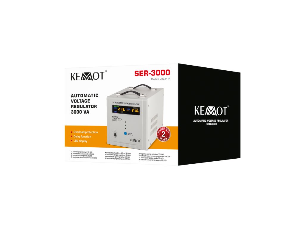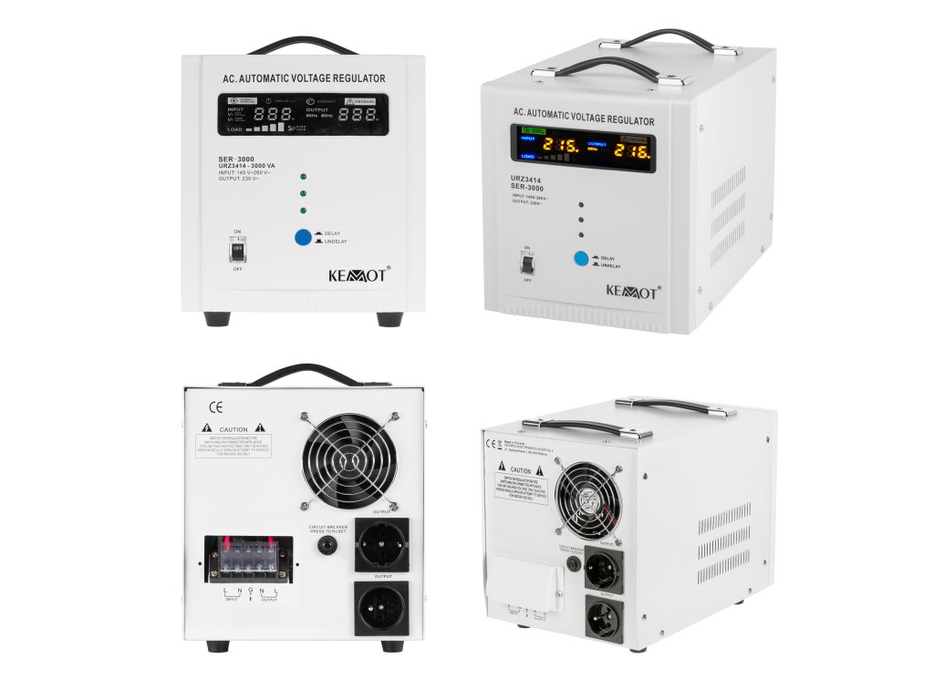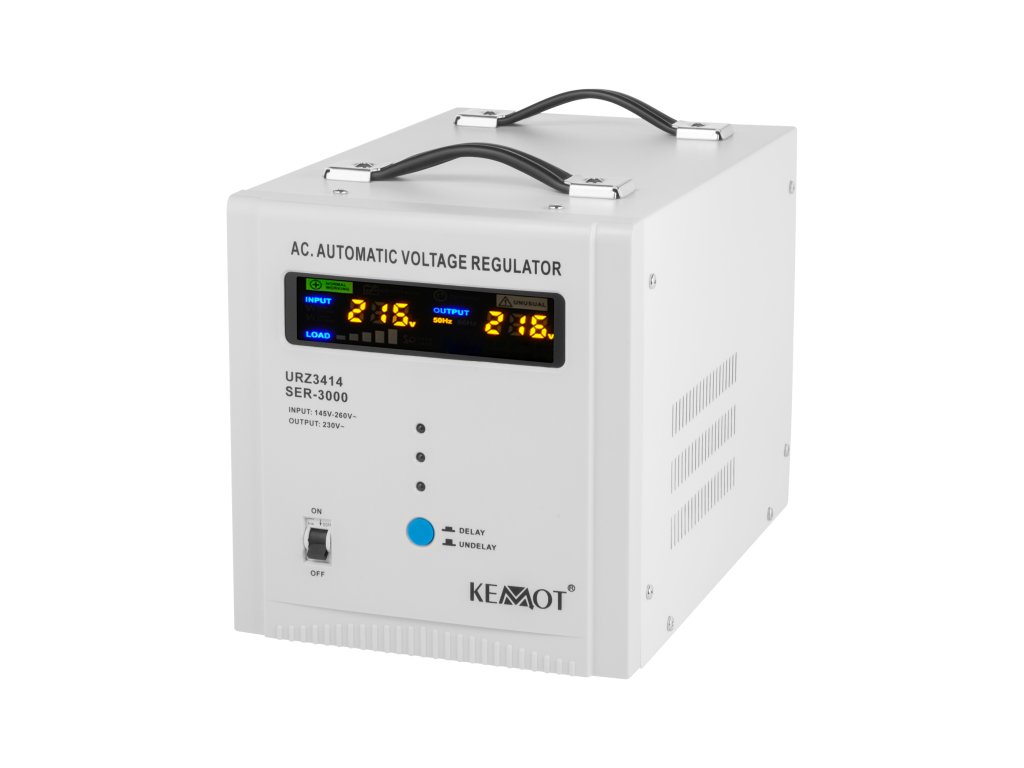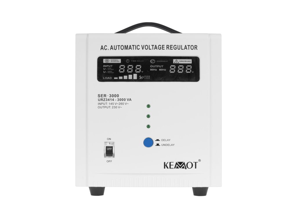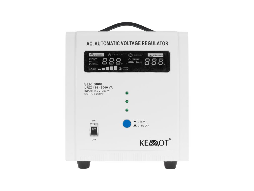 Če potrebujete stabilizator napetosti za naprave, ki imajo velik kratkotrajni zagonski tok, izberite model, opremljen s funkcijo zamika vklopa DELAY. KEMOT SER-2000 je opremljen z gumbom za zamik vklopa DELAY v obsegu od 6 do 180 sekund, kar zmanjša tveganje za njegovo poškodbo, če so nanj priključene naprave z velikim kratkotrajnim zagonskim tokom. Poleg tega stabilizator SER-2000 vsebuje zaščito pred previsoko in prenizko napetostjo, preobremenitvijo, pregrevanjem in kratkim stikom.