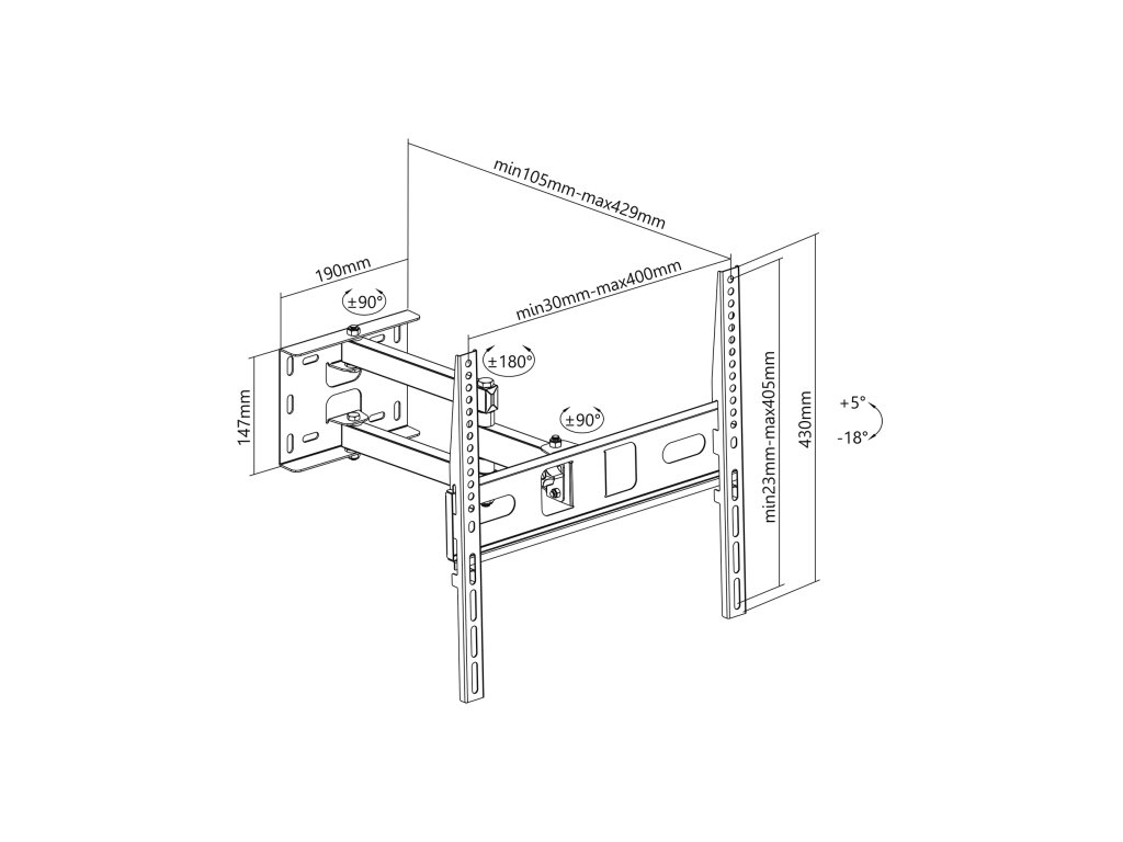 Iščete nosilec, ki omogoča prilagodljivo nastavitev televizorja? Univerzalni stenski nosilec za LED TV (32-55") ponuja popolno prilagoditev kota gledanja, kar omogoča prilagoditev televizorja vašim potrebam. Zahvaljujoč funkciji prilagoditve navpično od +5° do -18° ter vodoravno od +90° do -90°, lahko enostavno spreminjate kot gledanja, da dosežete udoben pogled, ne glede na to, s katerega mesta želite gledati svoje najljubše vsebine.