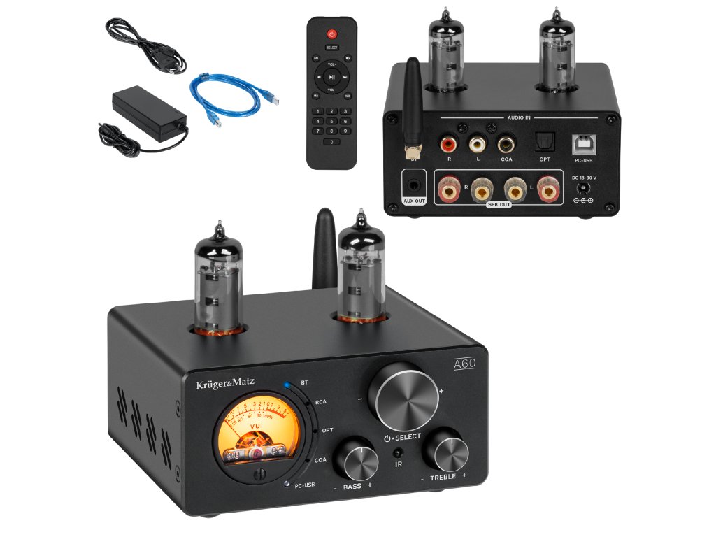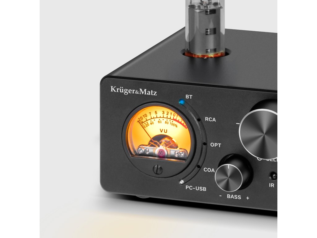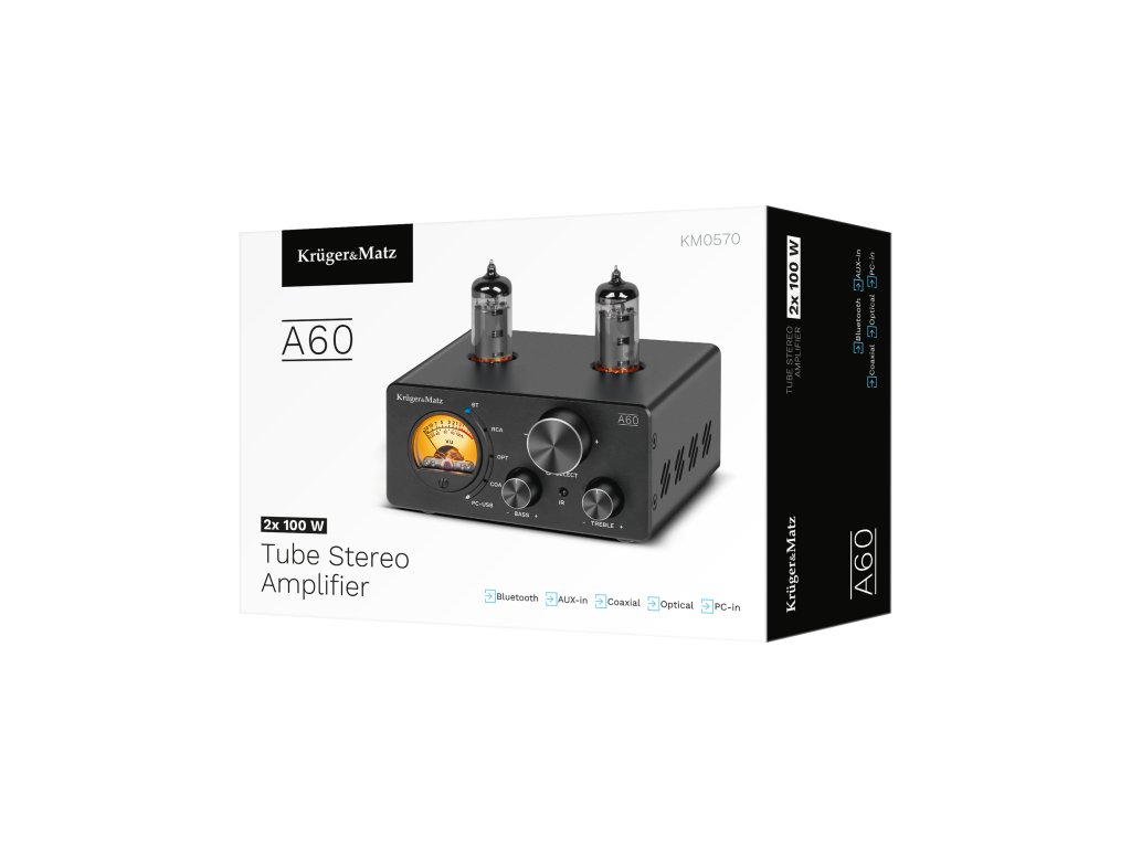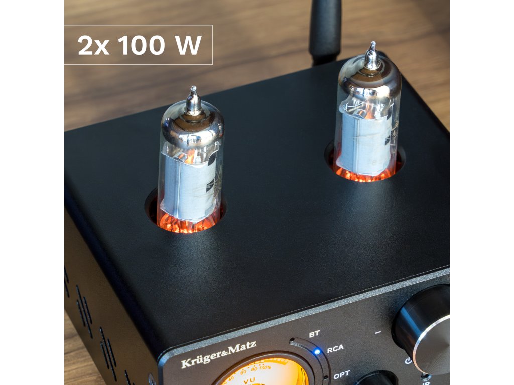 Stereo ojačevalnik Kruger&Matz, ki deluje z močjo 2x100, se odlikuje po uporabi cevi 6K4, ki ustvarjajo topel in naraven zvok z veliko globino in čistostjo.