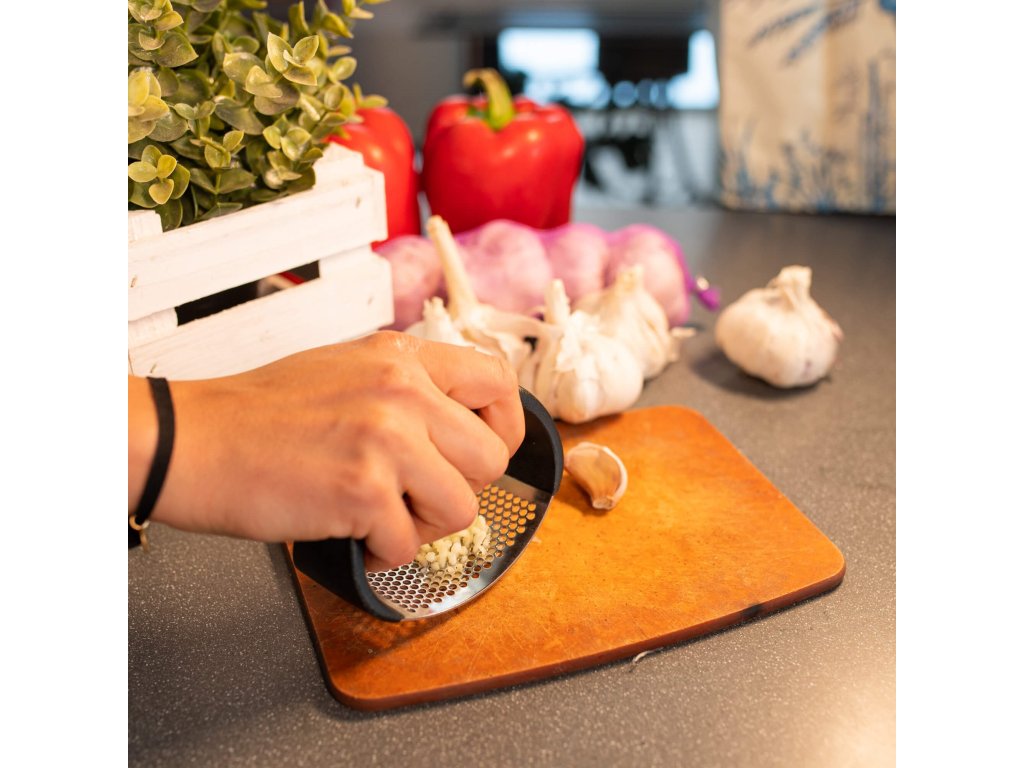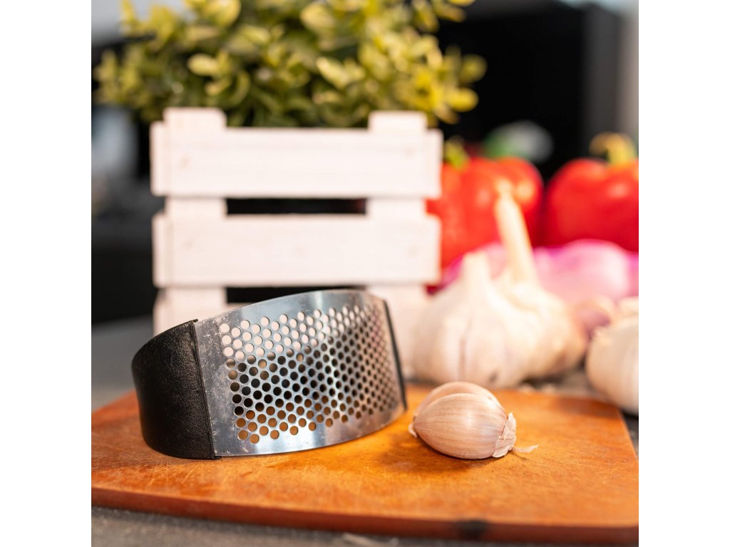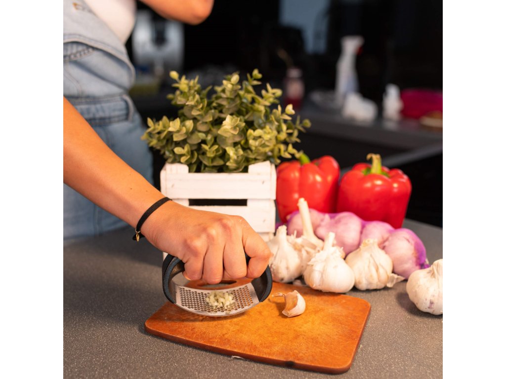 - Velik jeklen del za stiskanje česna - zmore tudi več strokov naenkrat!