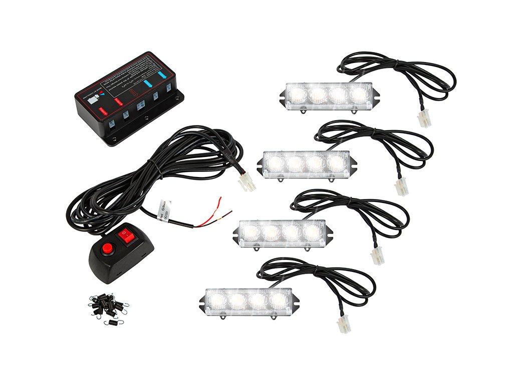 Profesionalni komplet LED stroboskopov 12V. Komplet sveti z oranžno svetlobo, možnost izbire več svetlobnih programov z upravljalnikom, stroboskopi so odporni na vodo. Moč kompleta je do 16W.