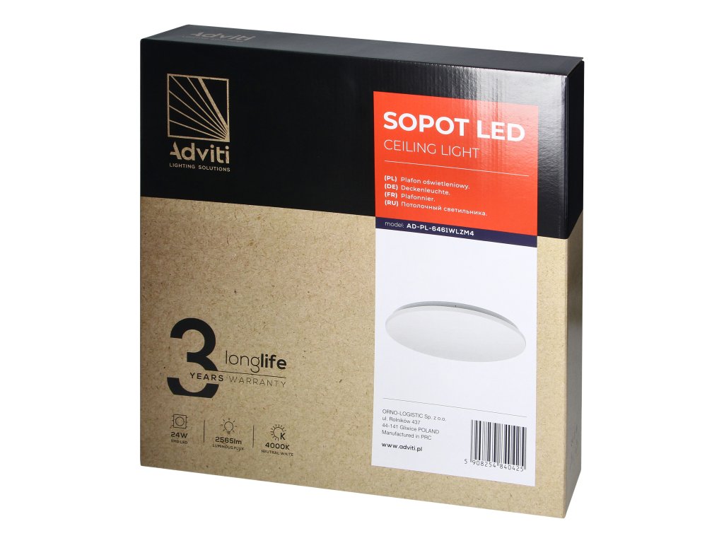 SOPOT je 24 W LED stropna svetilka z nevtralno barvo svetlobe (4000 K) in svetlobnim tokom 2565 lm. Svetilka je primerna tudi za samostojno montažo.