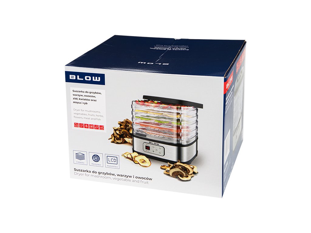 Sušilnik za gobe znamke BLOW je nepogrešljiv pripomoček za vse ljubitelje sušenih izdelkov in zdrave prehrane. S 240W moči naprava pospešuje naravno metodo sušenja brez večjega napora in našega vpletenja. Sušilnik je idealen v sezoni gobarjenja, v preostalih obdobjih pa nam bo služil za sušenje zelenjave, sadja, zelišč ter mesa in rib. Značilnosti:- Ekonomično in učinkovito sušenje- Idealno za gobe, sadje, zelenjavo, zelišča, cvetje, meso, ribe- Nastavljiva temperatura v razponu od 40-70°C- 5 nastavljivih slojev sušilne površine- Pokrov z priročnim ročajem za lažje odpiranje- Sodobna podoba Specifikacije:- Število slojev: 5- Ventilator: da- Razpon temperature: 40-70°C- Stikalo za vklop/izklop: da- Napetost: 220-240V, 50Hz- Moč: 240WPakiranje vsebuje:- Sušilnik za gobe, zelenjavo in sadje- Pokrov z ročajem- 5 sit- Navodila za uporabo v poljščini in angleščini