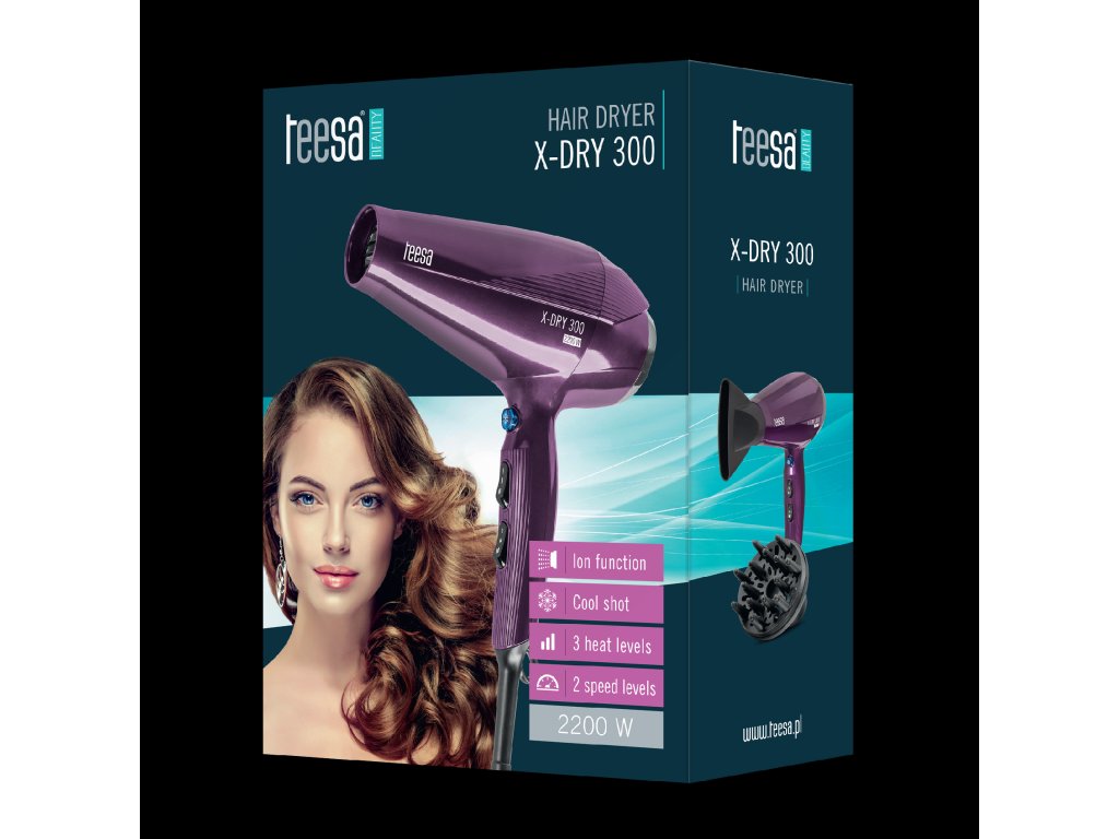 Fen Teesa X-DRY 300 je udobna naprava za uporabo z veliko močjo do 2200 W, ki omogoča hitro in učinkovito sušenje las. Zahvaljujoč 3 stopnjam temperature in 2 hitrostima pihanja lahko prilagodite delovanje sušilnika glede na individualne potrebe, s čimer lasje ostanejo varni. Poleg tega hladen pih olajša zaključek pričeske in ji doda končno obliko, medtem ko funkcija ionizacije prepreči naelektrenost las, jih lažje oblikuje in zgladi posamezne pramene.