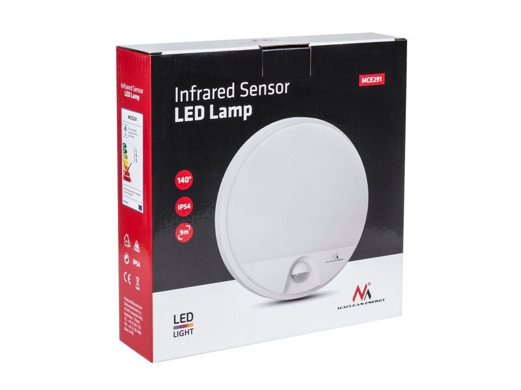 Visokokakovostna LED svetilka s infrardečim senzorjem gibanja MCE291 W Energetsko varčna LED svetilka z avtomatskim senzorjem, ki združuje visokokakovostno vezje in precizne zaznavne elemente. Svetilka zaznava zoro in mrak ter je opremljena z nastavitvijo časa osvetlitve in intenzivnosti okoliške svetlobe. Specifikacije Nazivna napetost: 220-240 V/AC Nazivna frekvenca: 50/60 Hz Svetlobna intenzivnost: <3-2000 LUX (nastavljivo) Časovna zakasnitev: min. 10 sek. ± 3 sek. - maks. 5 min. ± 1min. Kot zaznavanja: 140° Obseg zaznavanja: maks. 9 m (<24°C) Delovna temperatura: -20 ~ +40°C Dovoljena delovna vlažnost: <93% RH Višina namestitve: 1,8 - 2,5 m Nazivna obremenitev: 15W (1100 lm) Svetlobna temperatura: 4000K nevtralno bela Življenjska doba: 30000 ur Hitrost zaznanega gibanja: 0,6 - 1,5 m/s Razred IP: IP54 Razred zaščite pred električnim udarom: II Set vključuje LED svetilko s infrardečim senzorjem gibanja MCE291 W Montažni vložki Navodila za uporabo Embalaža proizvajalca Značilnosti Barva svetlobe: naravna bela 4000K Nastavitev časa osvetlitve od 10 sekund do 5 minut Nastavljiv senzor mraka Zaznavni kot senzorja: 140° Zelo enostavna za namestitev in uporabo Primerna za notranjo in zunanjo uporabo Razred zaščite: IP54Visokokakovostna LED svetilka s infrardečim senzorjem gibanja MCE291 W