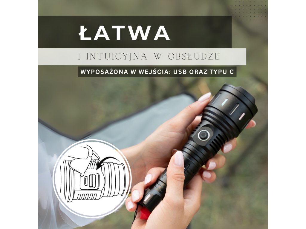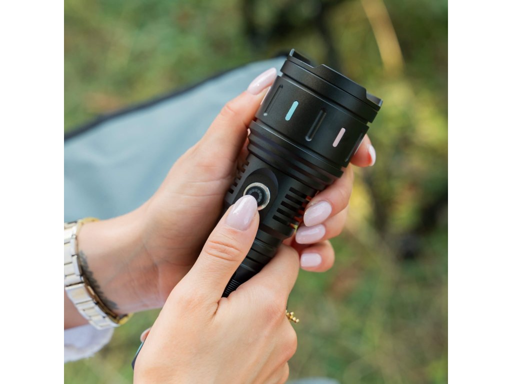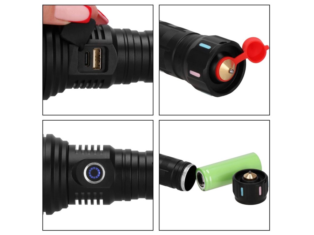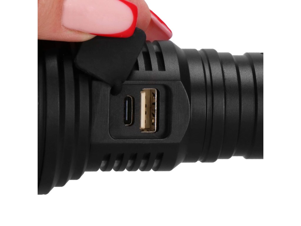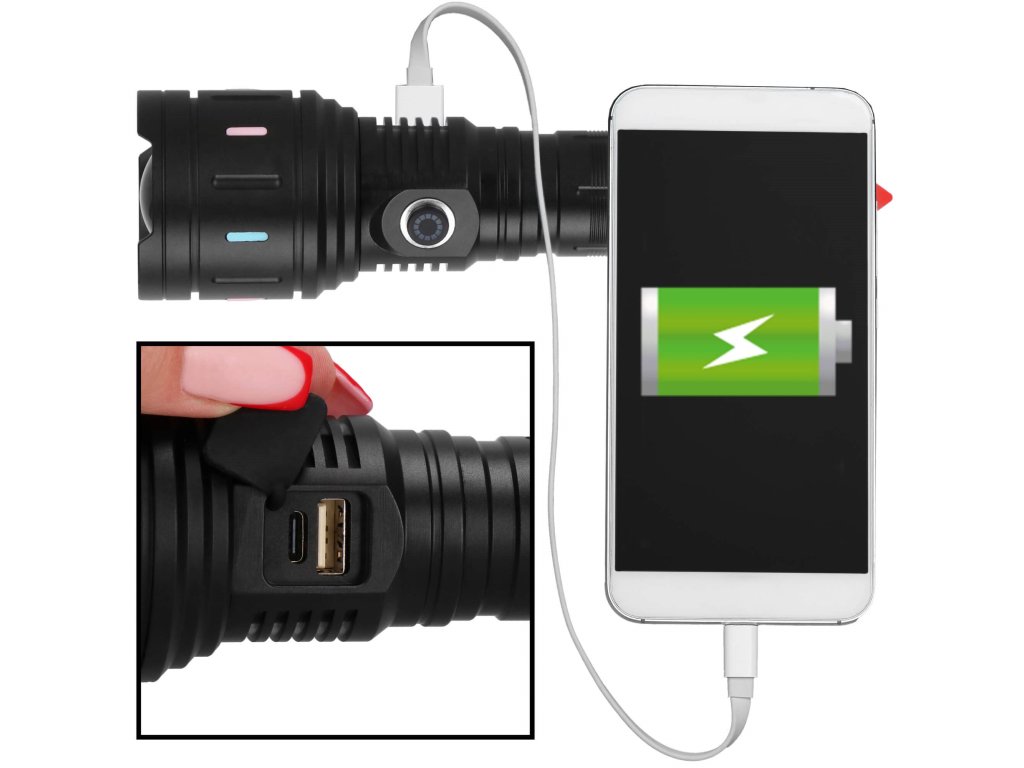 - Možnost polnjenja telefona ali drugih naprav z vhodom tipa C ob priklopu na svetilko - LED dioda gumba ON/OFF sveti modro