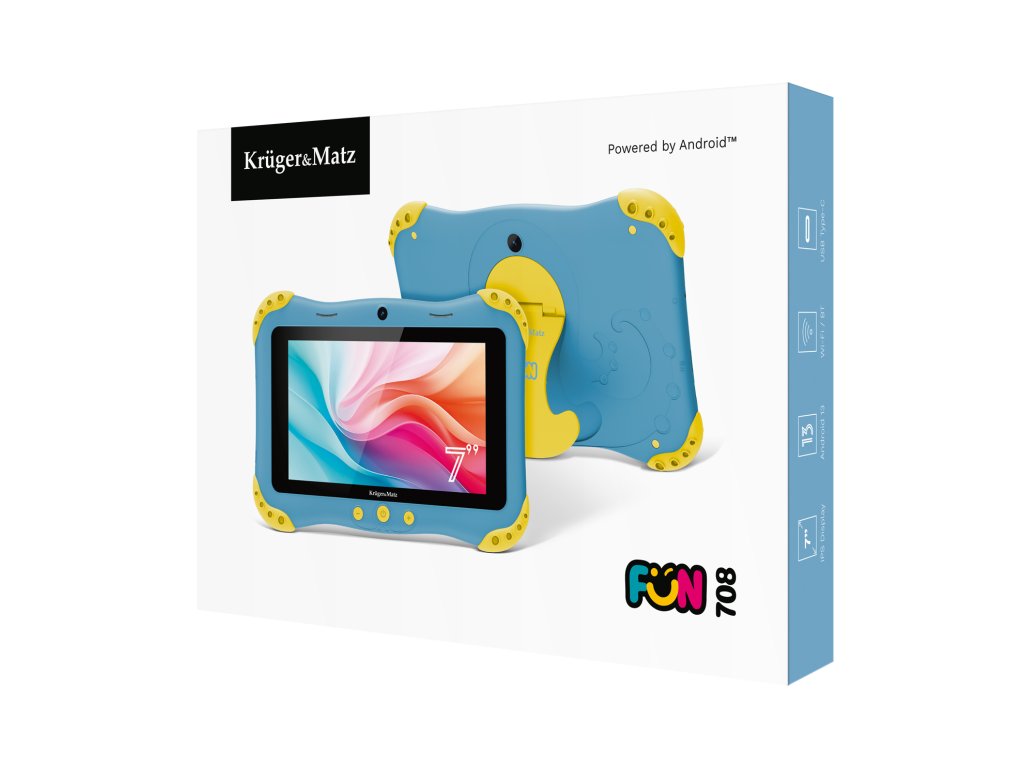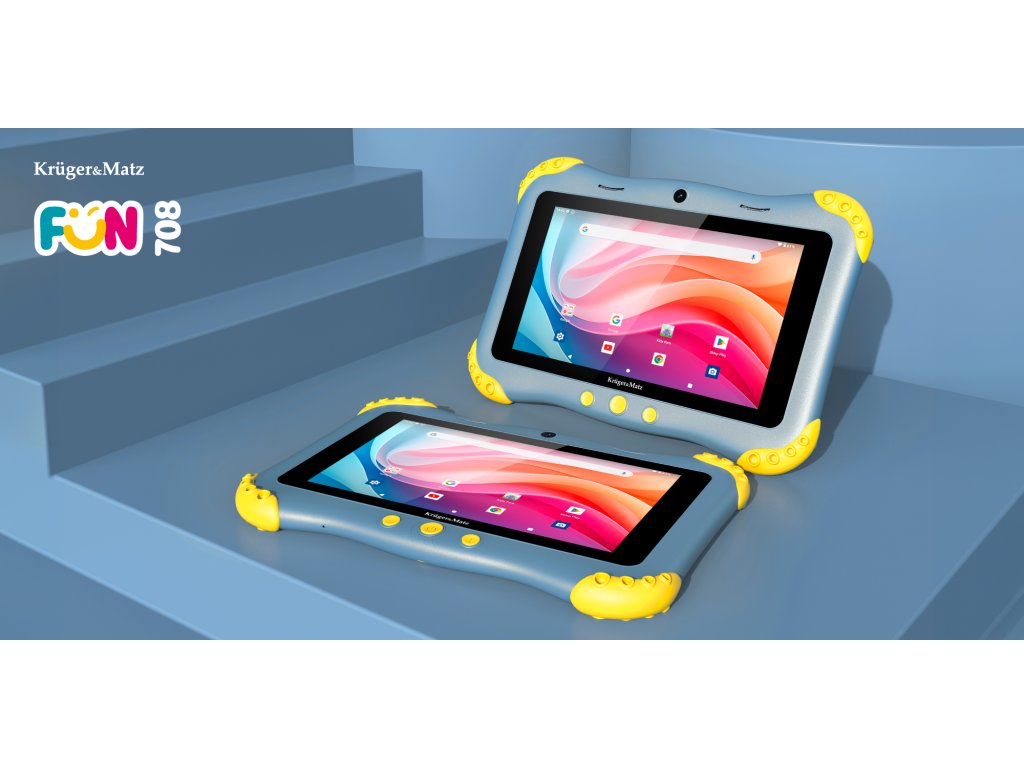 Otroške tablice bi morale biti drugačne ne le s trdno konstrukcijo, temveč tudi z zanimivim dizajnom, ki pritegne že na daljavo. S tem v mislih je barvni ovoj tablice Kruger&Matz FUN 708 opremljen z gumijastimi vogali, ki nudijo zaščito pred naključnimi padci in udarci.