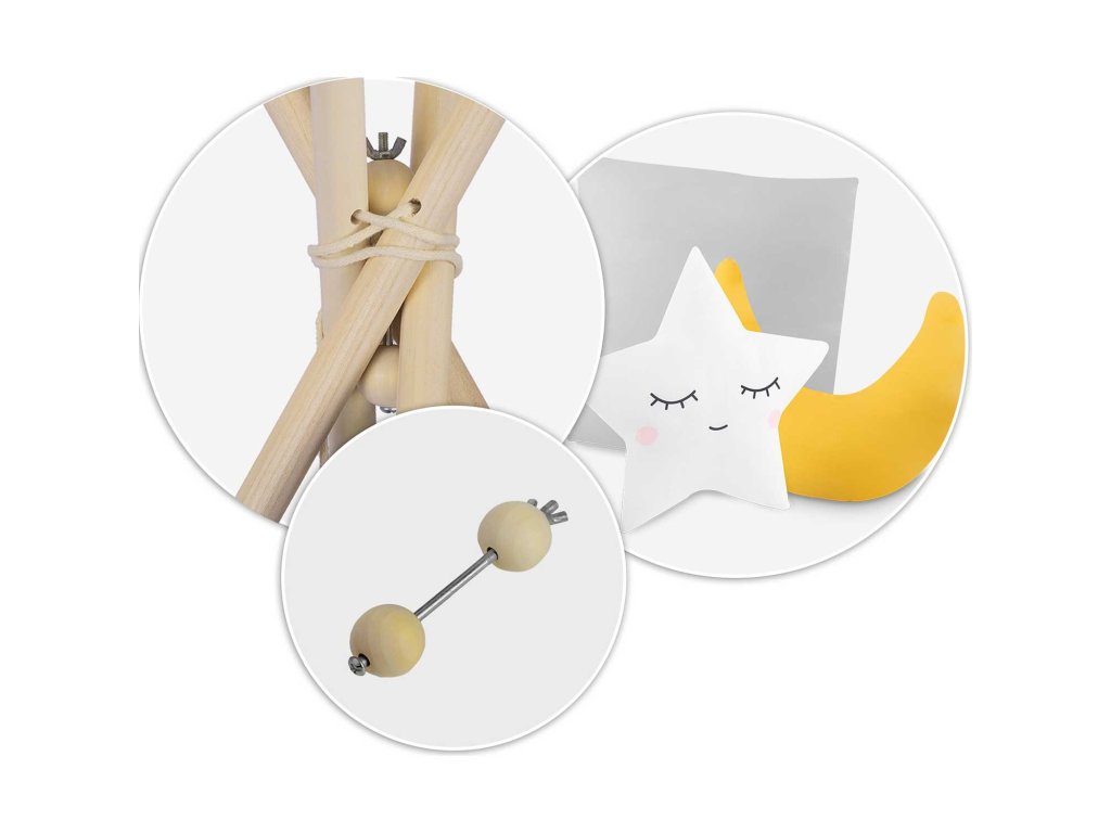 Za večjo zaščito otrok komplet teepee vključuje stabilizator. Zahvaljujoč temu vam ni treba skrbeti za svojega otroka; šotor je maksimalno varen in ga je enostavno premakniti na drugo mesto.