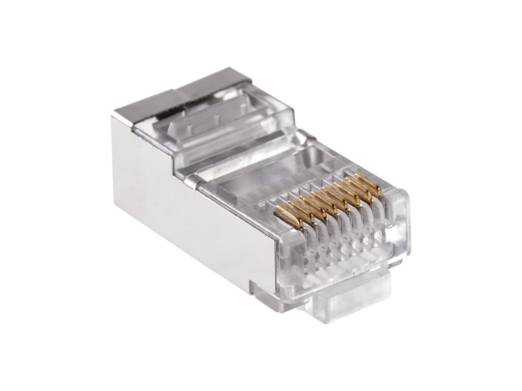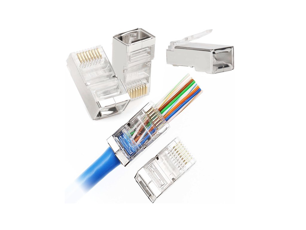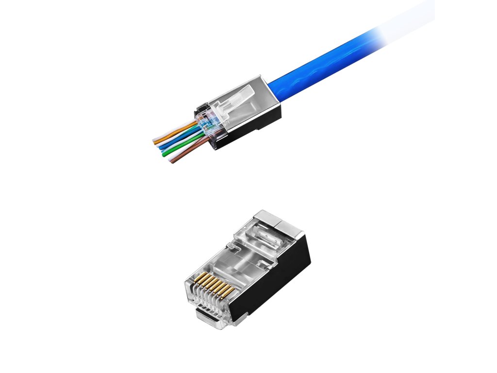 Vtiči 8P8C – RJ45 Kat5e pretočni, oklopljeni FTP. Sistem Pass Through omogoča vlečenje celotnega kabla skozi vtič (vtič mora biti prav tako Pass Through). Prednost pred tradicionalnim stiskanjem konektorjev je ta, da sistem omogoča vlečenje kablov skozi vtič in njihovo enakomerno razporeditev. Po popolnem stiskanju klešče odstranijo odvečne kable iz vtiča. To zagotavlja veliko boljše in natančnejše stiskanje vtiča. Vtiči so najvišje kakovosti, vsak pin je prevlečen s 3-mikrometrsko plastjo zlata, ki preprečuje korozijo stika. Vtiči so pakirani v vrečke z zadrgo. Vtiči so namenjeni kablom tipa žica.Vtiči 8P8C – RJ45 Kat5e pretočni oklopljeni FTP
