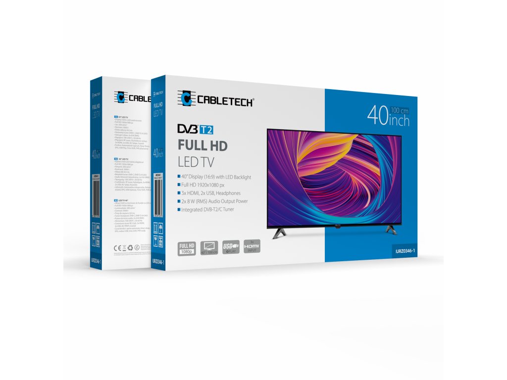 Televizor Cabletech je opremljen s panelom, izdelanim v tehnologiji D-LED, kar zagotavlja zelo dobro reprodukcijo barv. Poleg tega ločljivost Full HD, svetlost na ravni 200 cd/m2, visok kontrast 3000:1 in odzivni čas do 8,5 ms naredijo gledanje vaših najljubših programov in filmov še bolj prijetno.