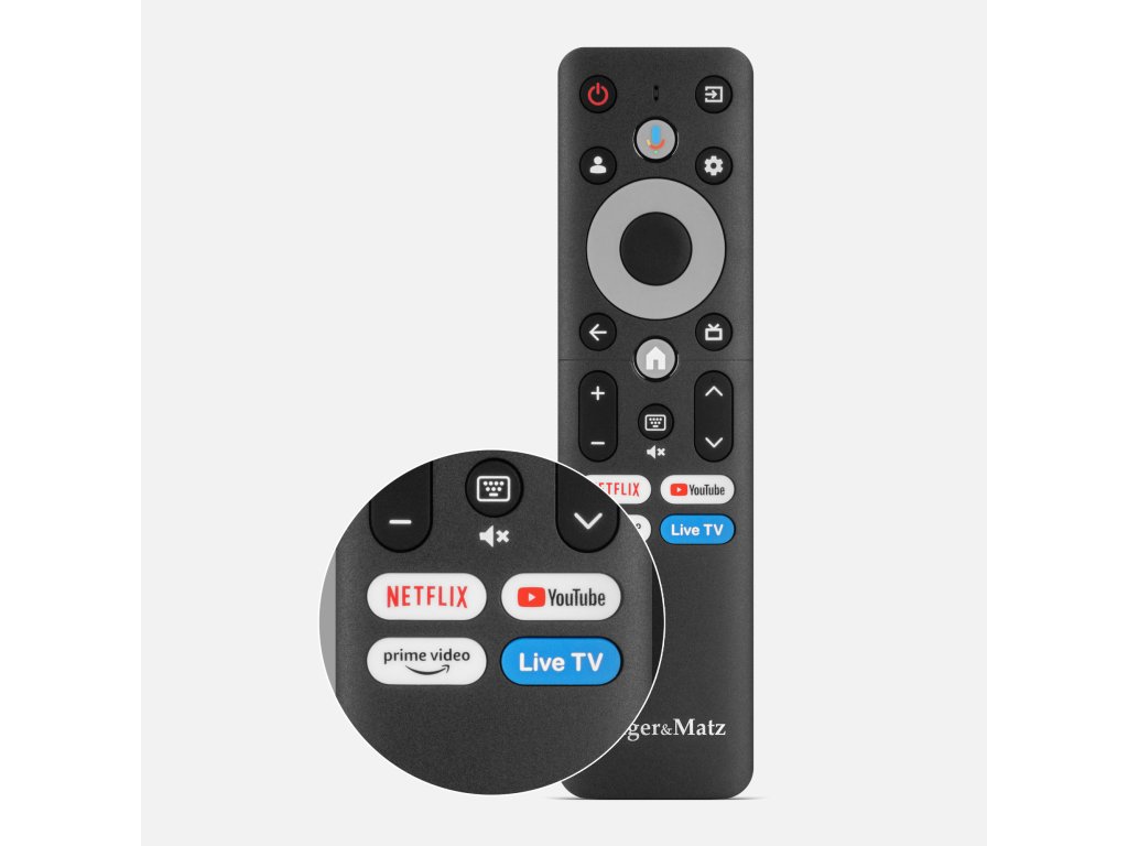 Daljinski upravljalnik, priložen televizorju Kruger&Matz, je zasnovan z mislijo na udobno in intuitivno uporabo. Na upravljalniku so bližnjice do najbolj priljubljenih aplikacij, kot so Netflix, YouTube ali Amazon Prime Video. Z njimi lahko hitro zaženete priljubljene vsebine, ne da bi morali brskati po meniju ali iskati aplikacije.