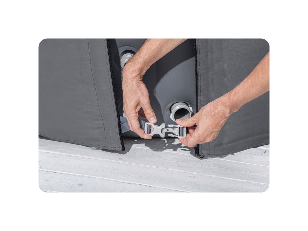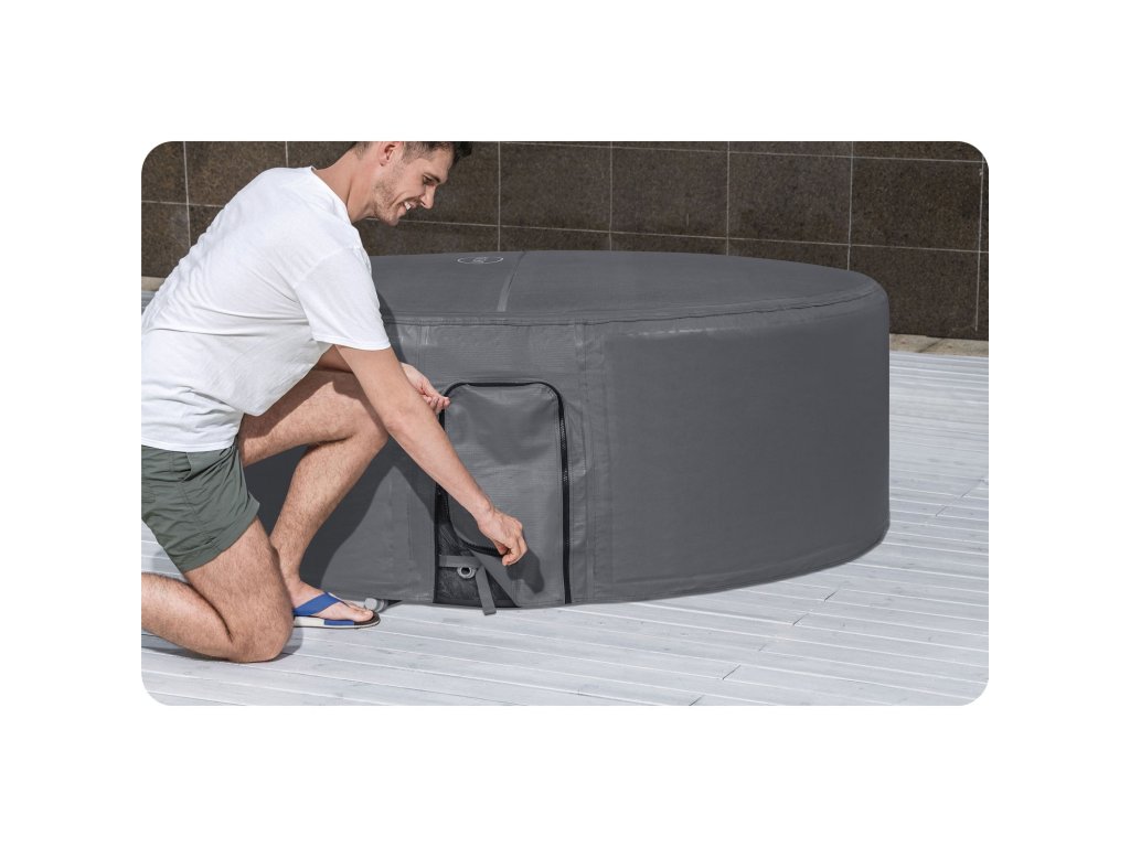 Pokrov je opremljen z zadrgo za priklop črpalke. Njegova prednost je enostavna in intuitivna montaža. Narejen je iz trdnega materiala. To je eden od pomembnih elementov, ki pomaga prihraniti vaš denar! Če sanjate o tem, da bi bil vaš SPA hitro pripravljen za uporabo, ne odlašajte z nakupom.
