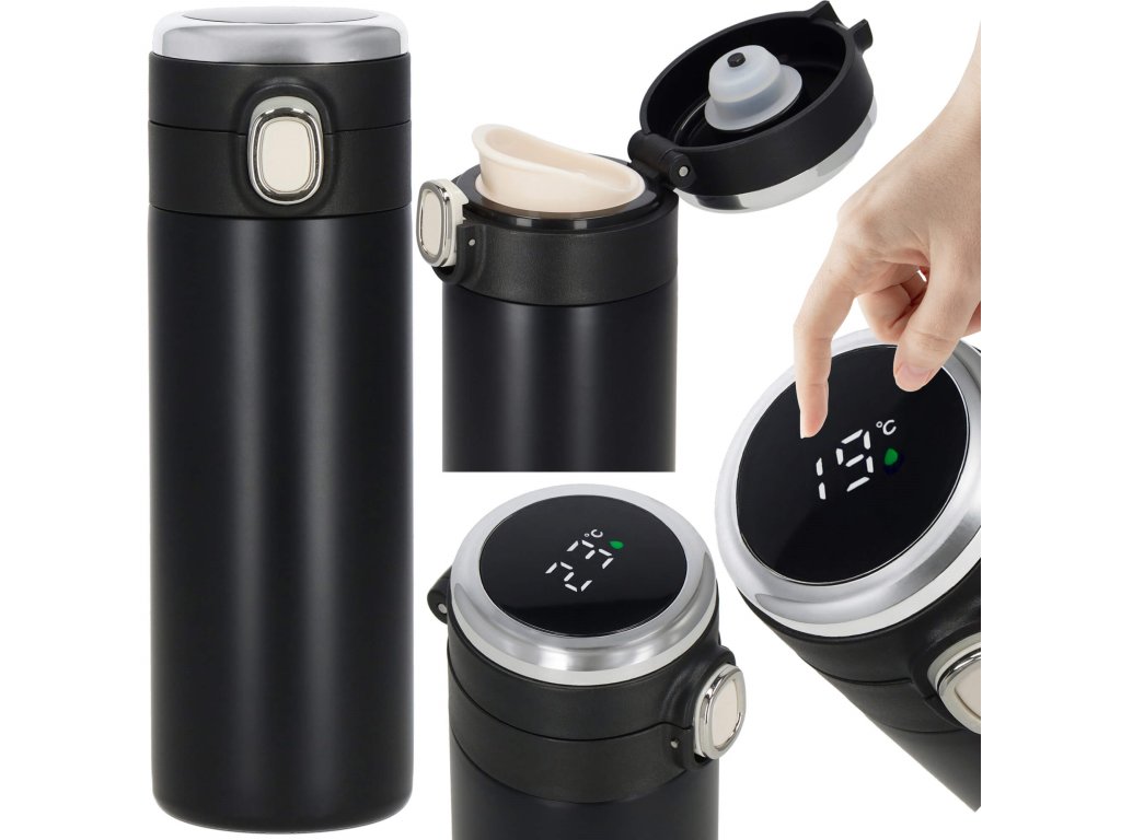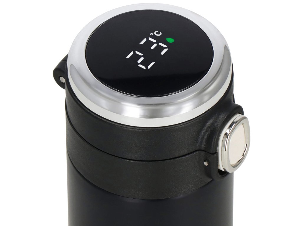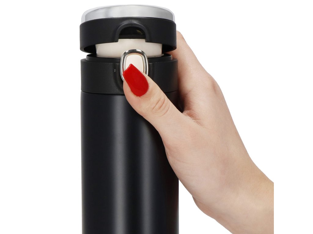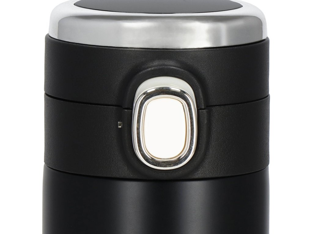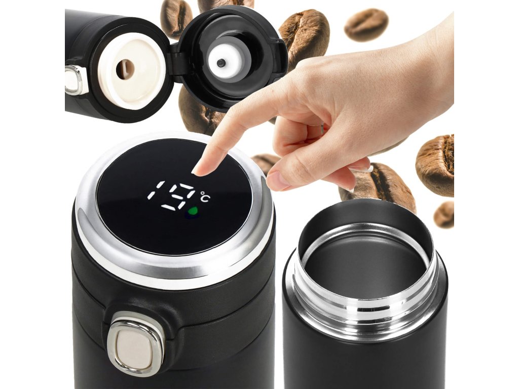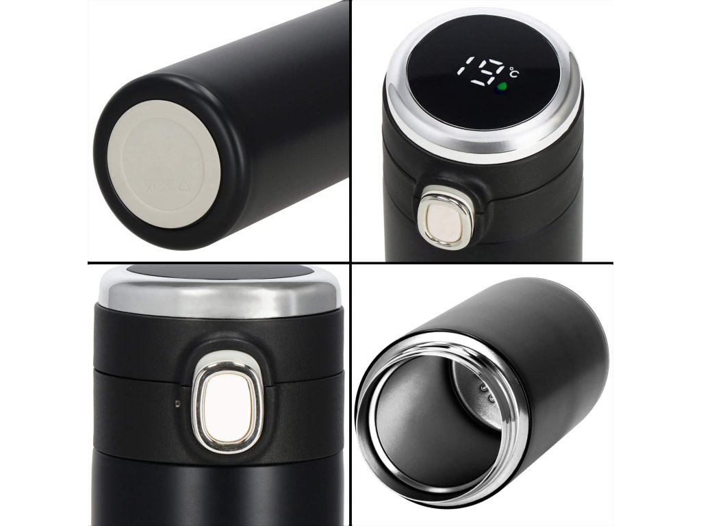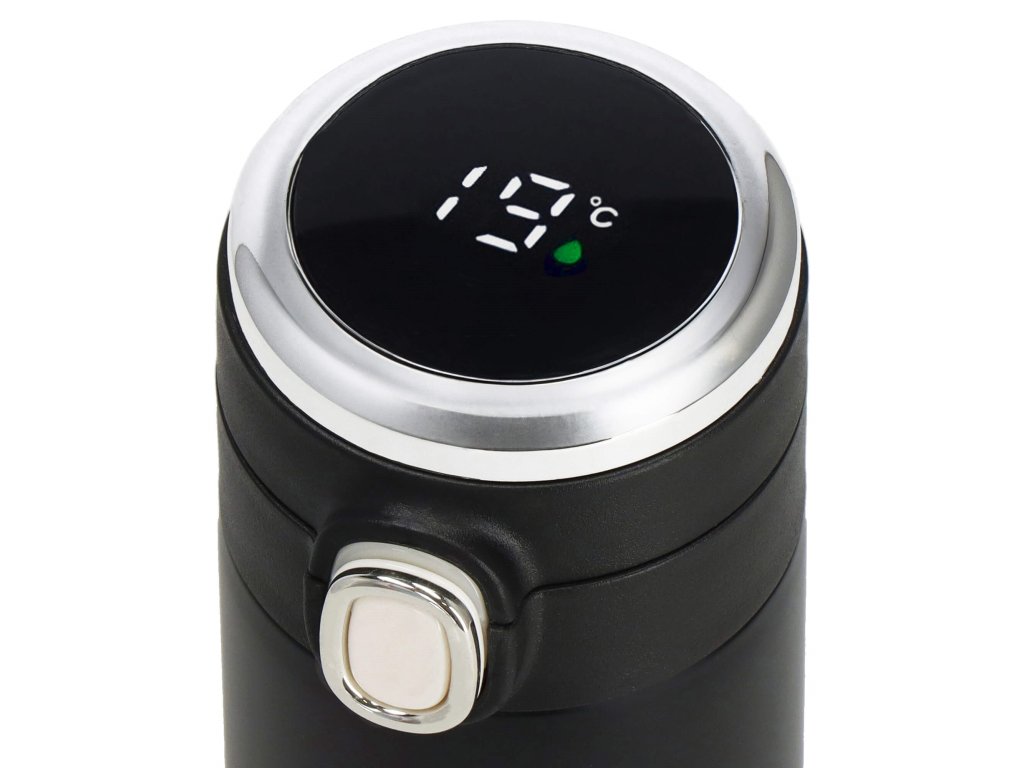 - Elektronický displej teploty na vrchu uzáveru, v stupňoch Celzia, farba kvapôčky na displeji indikuje stupeň tepla nápoja: zelená, oranžová, červená