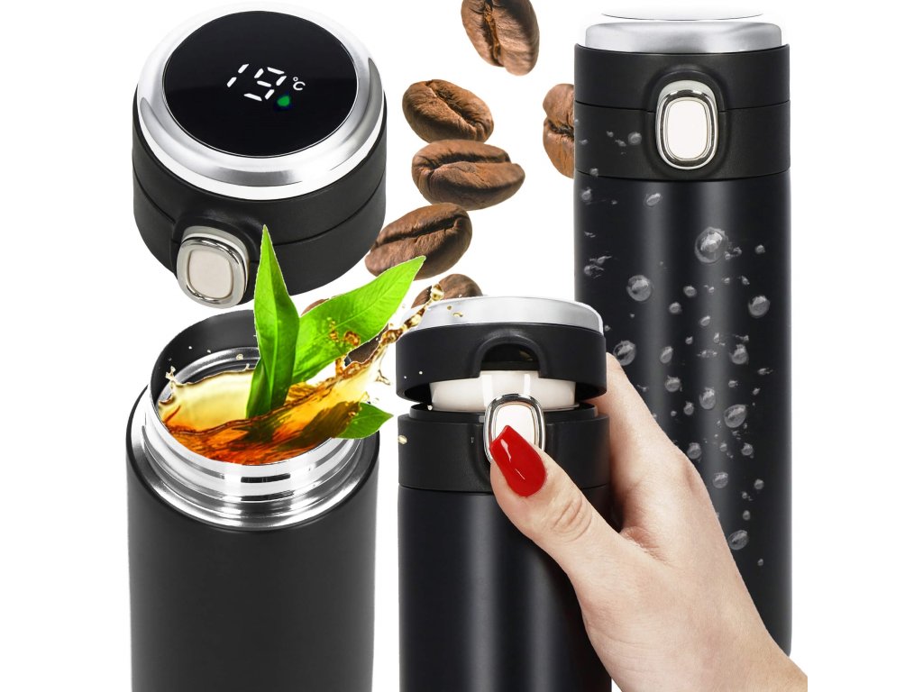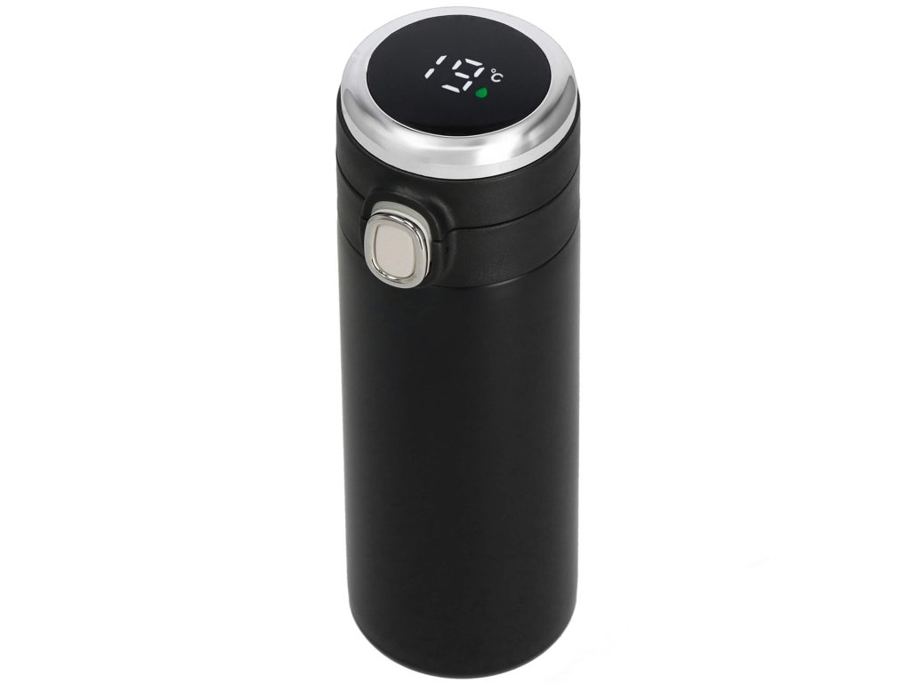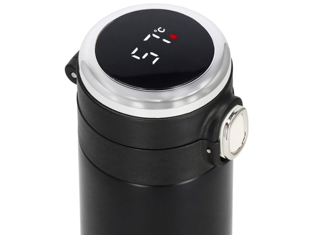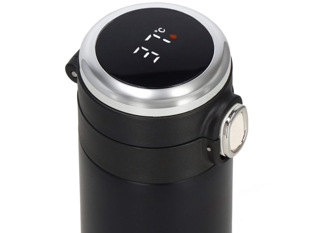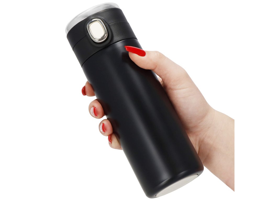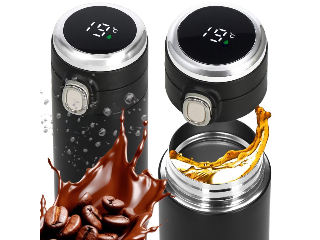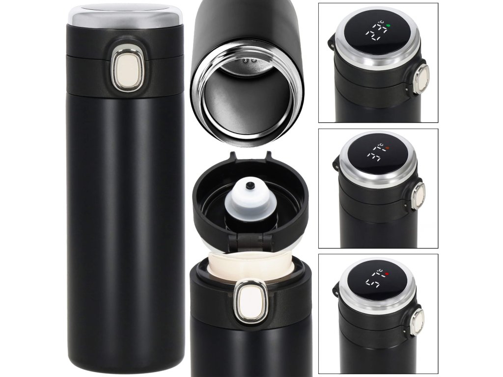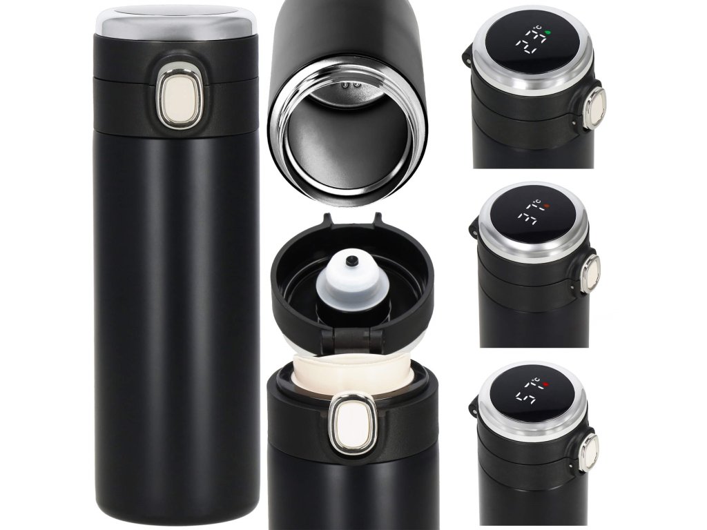 - Elektronický displej teploty na vrchu uzáveru, v stupňoch Celzia, farba kvapôčky na displeji indikuje stupeň tepla nápoja: zelená, oranžová, červená